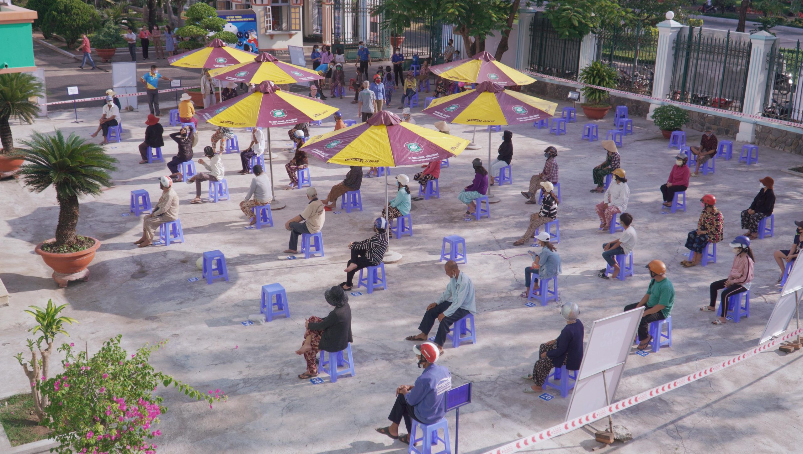 Bà con mang khẩu trang và giữ khoảng cách 2m theo quy định trong quá trình nhận gạo