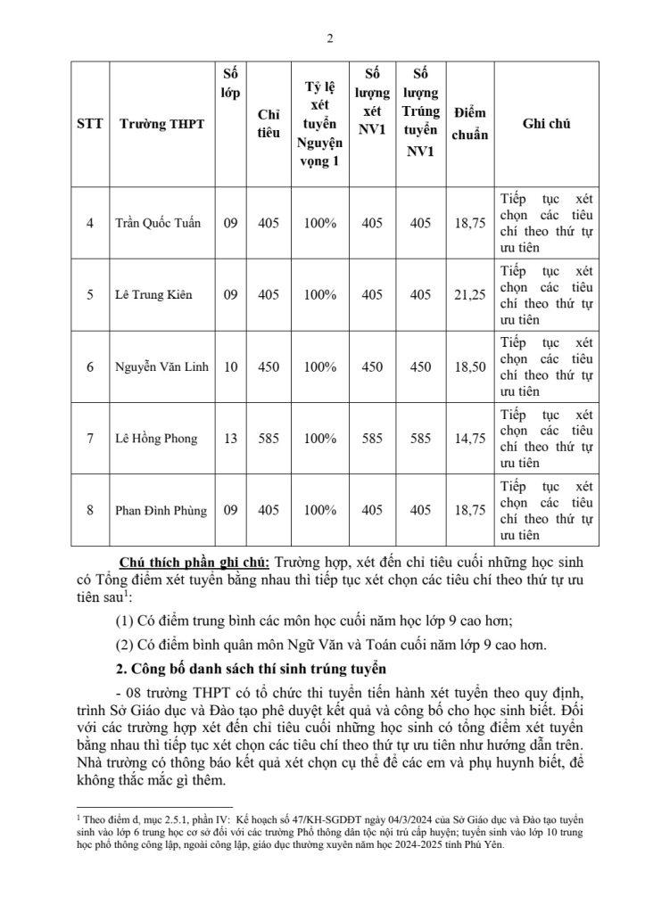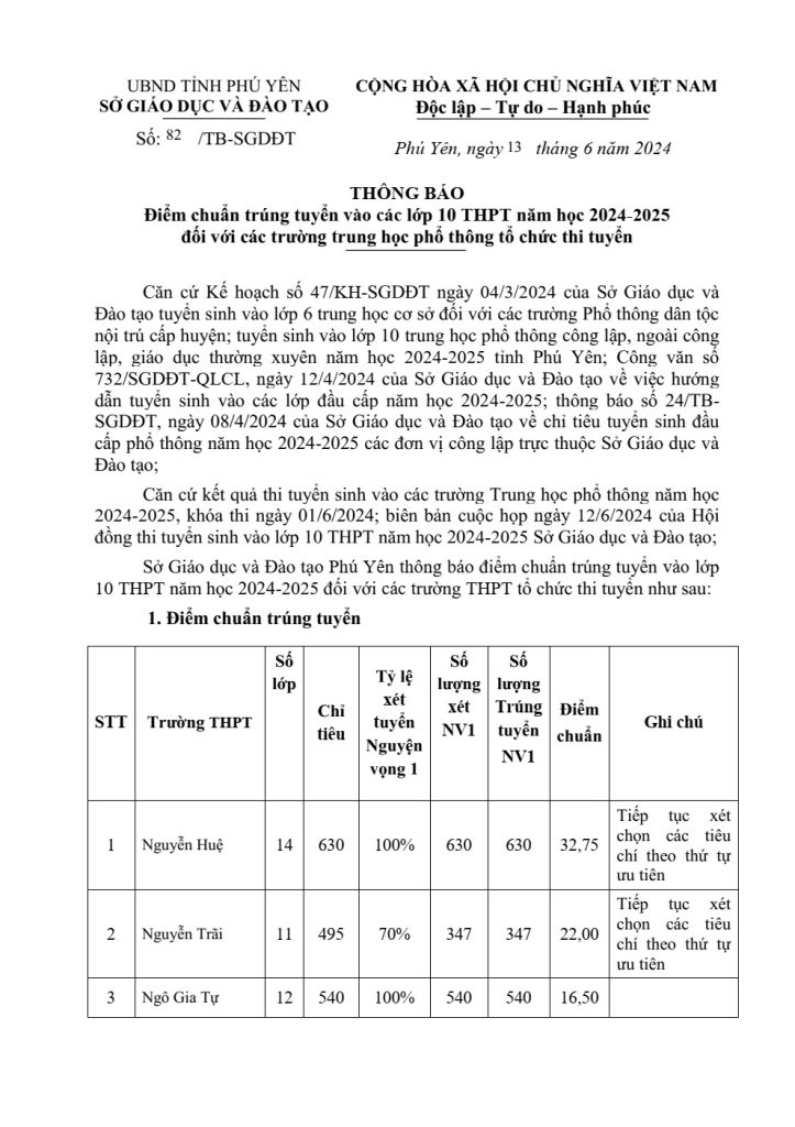 Ngày 13.6, Sở GD và ĐT Phú Yên công bố điểm chuẩn trúng tuyển nguyện vọng 1 kỳ thi tuyển sinh vào lớp 10 của các trường THPT trên địa bàn tỉnh tổ chức thi tuyển năm học 2024-2025.