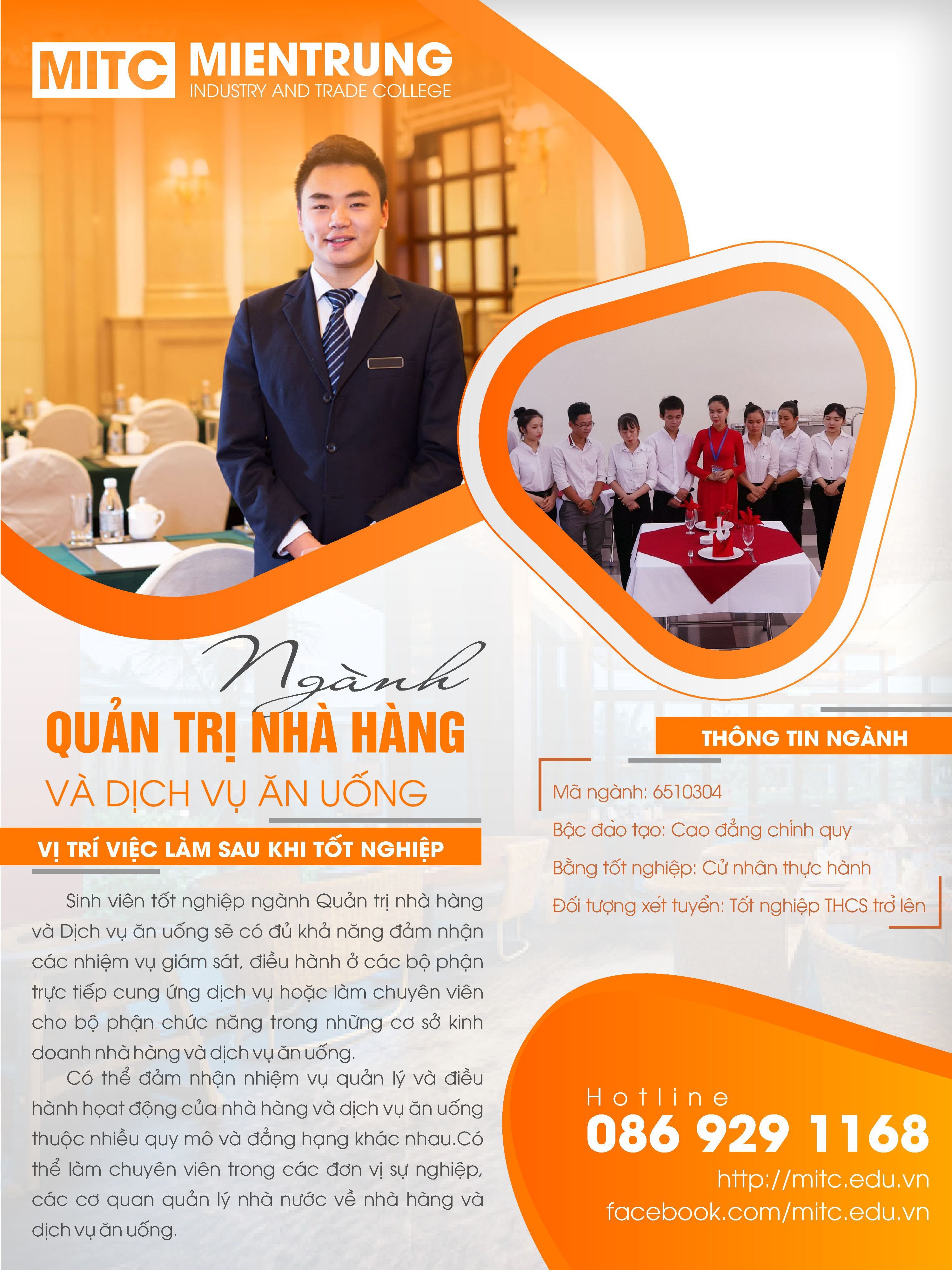 Với thế mạnh đào tạo nghiệp vụ bàn, nghiệp vụ bar, nghiệp vụ – thực hành bánh Âu, kỹ năng pha chế (Barista)… cùng chương trình đào tạo học kỳ doanh nghiệp, trường Cao đẳng Công Thương miền Trung đang từng bước khẳng định thương hiệu trong đào tạo ngành Quản trị nhà hàng và dịch vụ ăn uống. Đến với nhà trường sinh viên sẽ được tham gia các cuộc thi chuyên ngành, được đào tạo các kỹ năng nhà hàng khách sạn với 70% là thực hành. Tham gia các chương trình học kỳ doanh nghiệp, thực tập có hưởng lương tại các khách sạn khu nghỉ dưỡng nổi tiếng như Sala Tuy Hòa Beach, Khách sạn Zannier Bãi san hô…Một điều đặc biệt nữa là đội ngũ giảng viên trường Cao đẳng Công Thương miền Trung luôn là những chuyên gia có nhiều năm kinh nghiệm và luôn tâm huyết với nghề