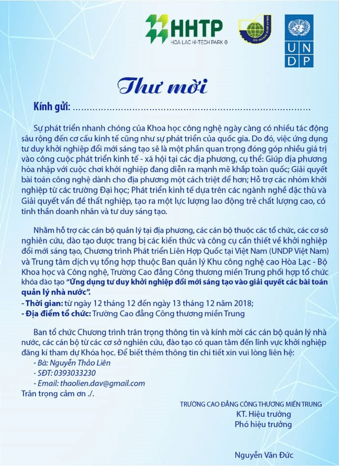 Thư mời tham dự Chương trình đào tạo: “Ứng dụng tư duy khởi nghiệp ĐMST vào giải quyết các bài toán quản lý nhà nước”