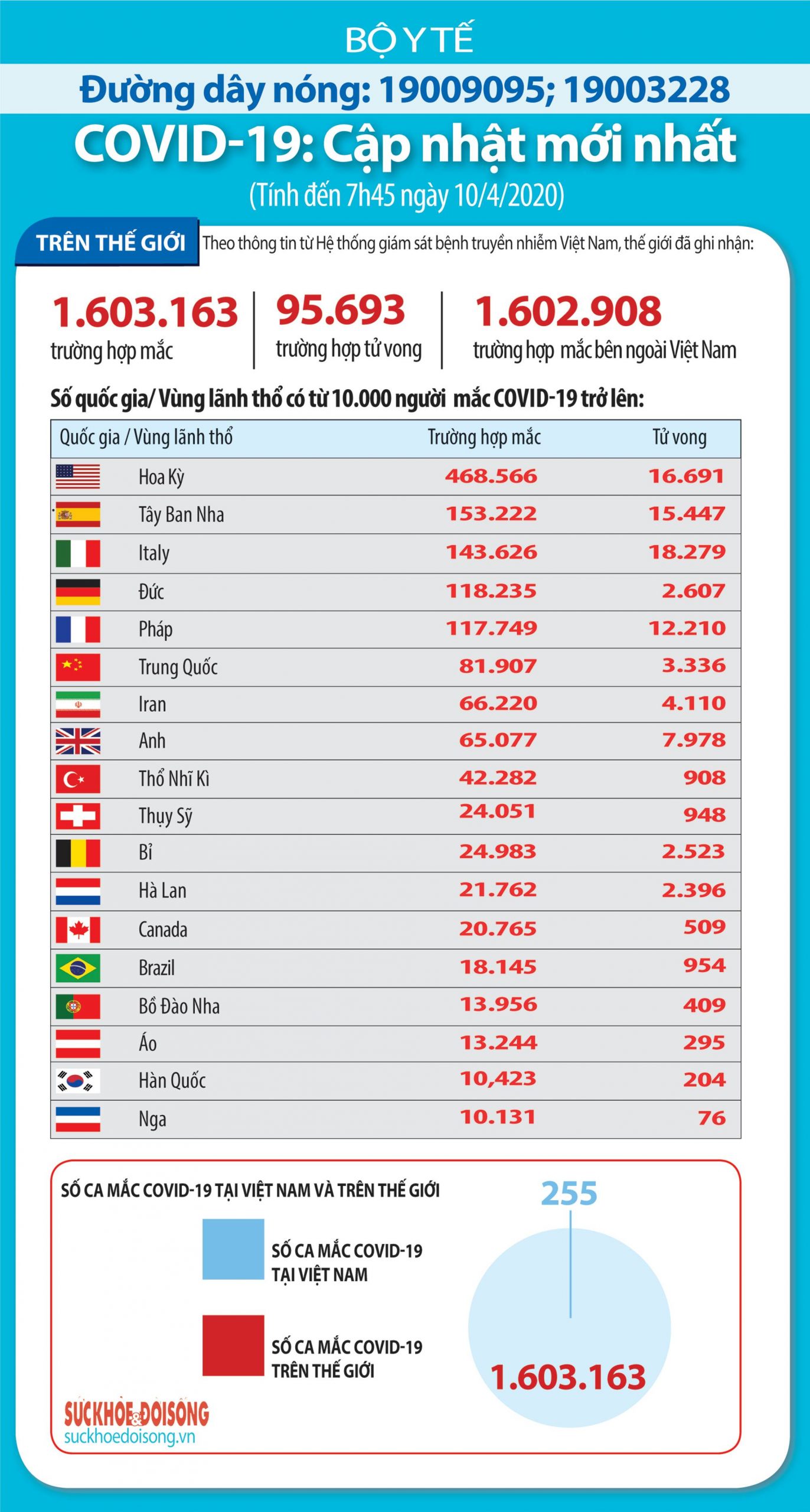 Thông tin mới nhất từ Bộ Y tế cho biết, tính đến 9h ngày 10/4, dịch bệnh COVID-19 đã lan rộng ra 210 quốc gia/ vùng lãnh thổ,với 1.603.163 người mắc; 95.693 người tử vong. Tất cả các nước trong khu vực Đông Nam Á đều có người mắc bệnh, với tổng số ca mắc là 16.479, số ca tử vong là 593.