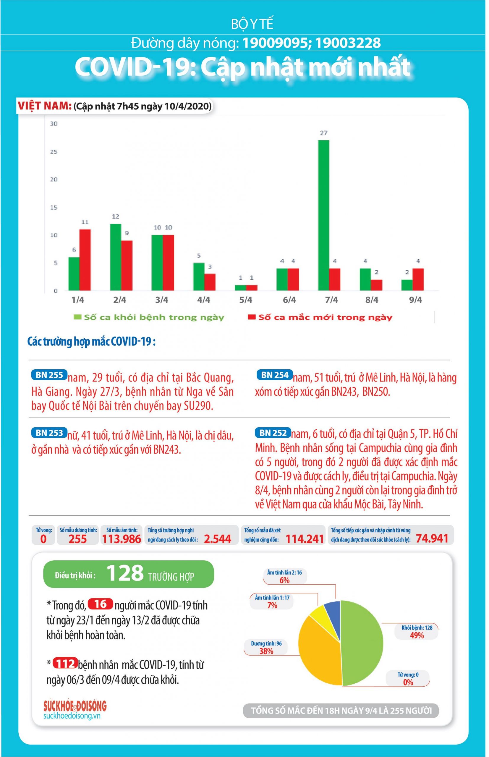 Tại Việt Nam, cả nước ghi nhận 255 ca mắc COVID-19 (trong đó có 158 người từ ngước ngoài, 97 người lây nhiễm thứ phát), không có người tử vong.