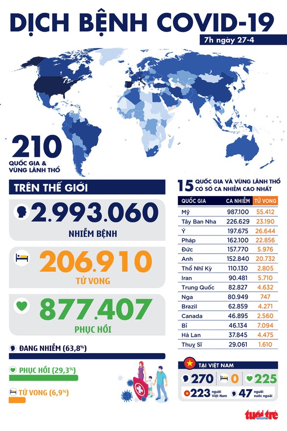 Tổng số ca nhiễm virus corona chủng mới ở Việt Nam hiện vẫn là 270, trong đó 225 người đã khỏi và ra viện.