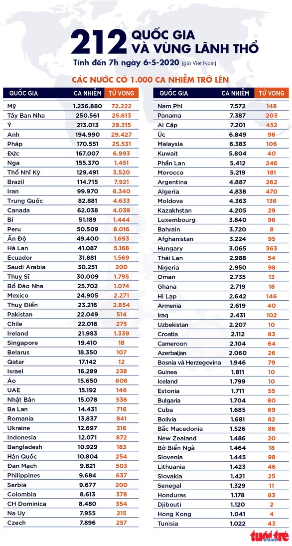 Trong khi đó, theo trang worldometers.info đến 5h30 ngày 6-5 (theo giờ Việt Nam), Mỹ hiện có 1.235.458 ca nhiễm và 72.149 ca tử vong.