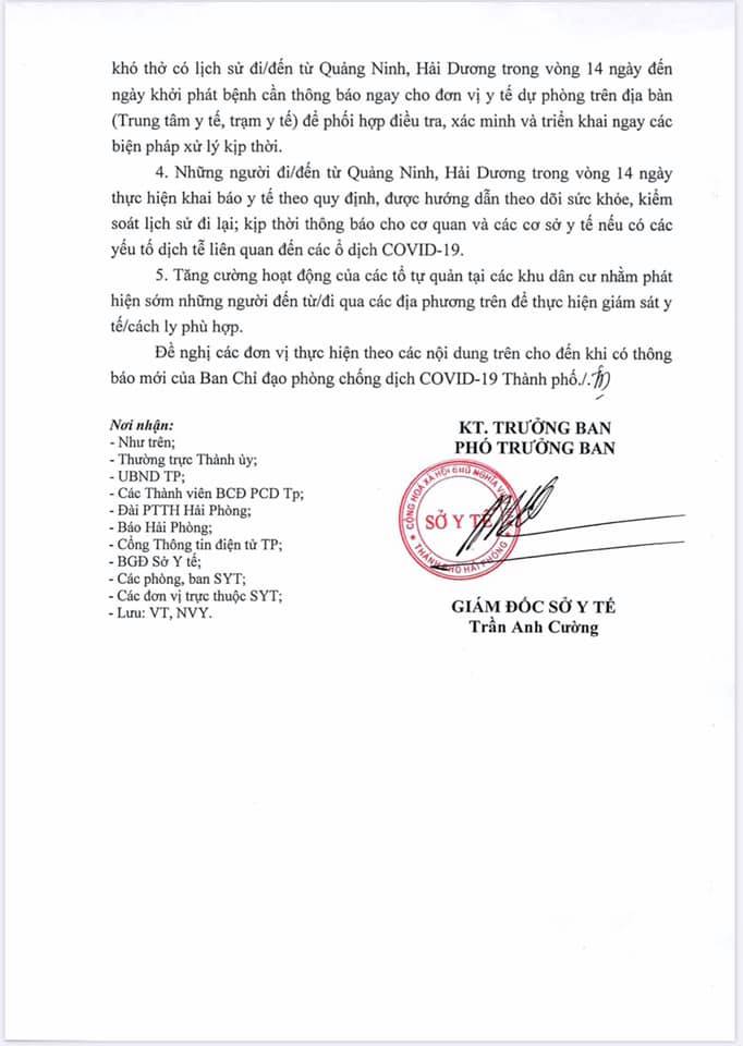 Công văn của Ban chỉ đạo Phòng chống dịch COVID-19 Hải Phòng.