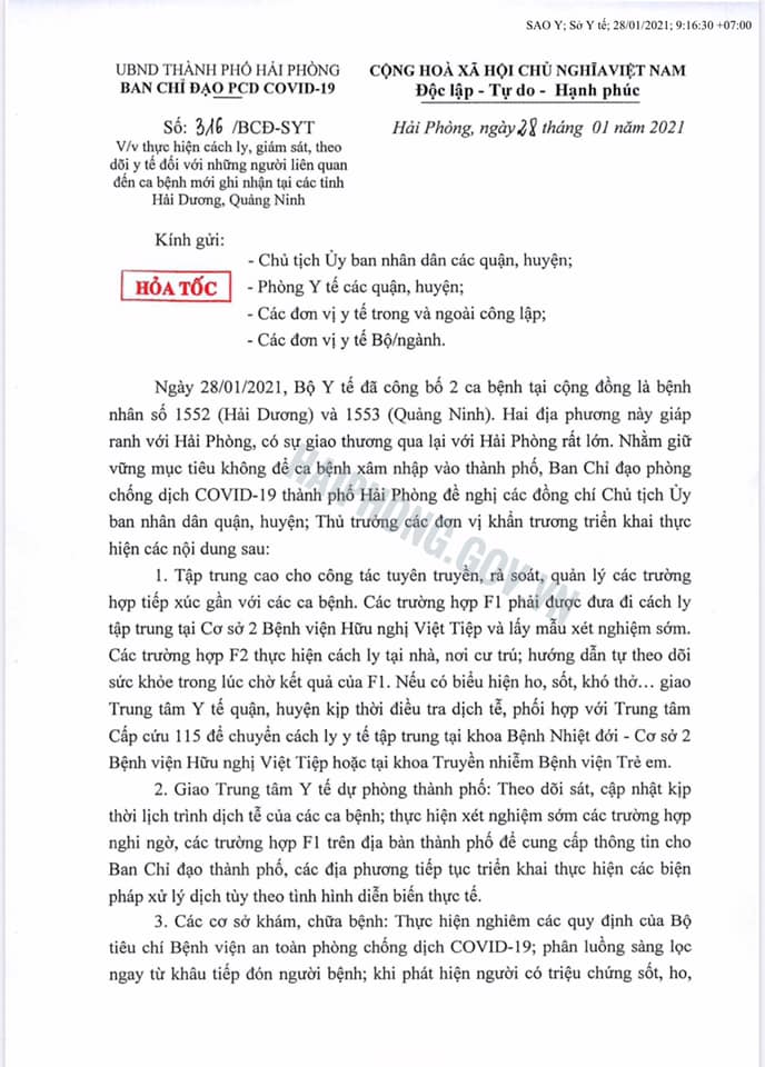 Ngày 28/01/2021 , Bộ Y tế đã công bố 2 ca bệnh tại cộng đồng là bệnh nhân số 1552 ( Hải Dương ) và 1553 ( Quảng Ninh ) . Hai địa phương này giáp ranh với Hải Phòng , có sự giao thương qua lại với Hải Phòng rất lớn . Nhằm giữ vững mục tiêu không để ca bệnh xâm nhập vào thành phố , Ban Chỉ đạo phòng chống dịch COVID – 19 thành phố Hải Phòng đề nghị các đồng chí Chủ tịch Ủy ban nhân dân quận, huyện, Thủ trưởng các đơn vị khẩn trương triển khai thực hiện các nội dung sau.