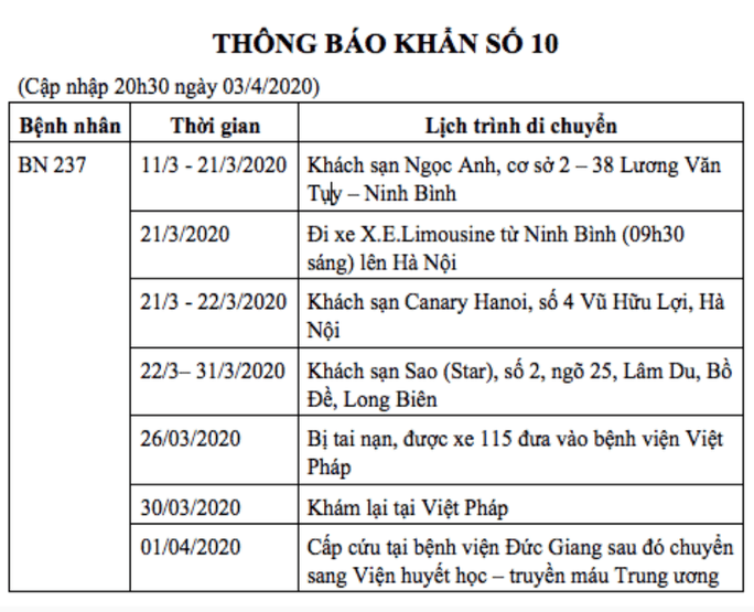 Tối 3-4, Bộ Y tế phát đi thông báo khẩn về trường hợp bệnh nhân Covid-19 số 237, người từng có hành trình đi tới nhiều bệnh viện, khách sạn tại Hà Nội, Ninh Bình.