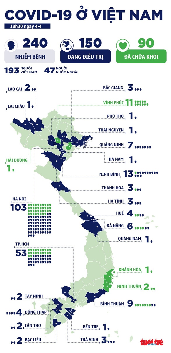 Như vậy đến thời điểm này, số ca nhiễm ở nước ta vẫn là 240, trong đó 149 ca là từ nước ngoài, 61 ca từ ổ dịch nội địa. Số ca được công bố khỏi bệnh và ra viện là 90, trong đó 4 ca mới nhất ở TP.HCM vừa được công bố khỏi bệnh hôm qua 4-4.