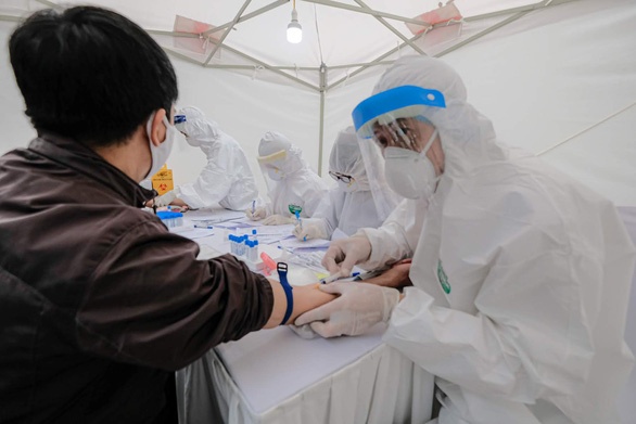 Xét nghiệm nhanh virus SARS-CoV-2 ở Hà Nội. Với xét nghiệm trích máu này, người dân sẽ nhận được kết quả chỉ sau 10 phút – Ảnh: NAM TRẦN