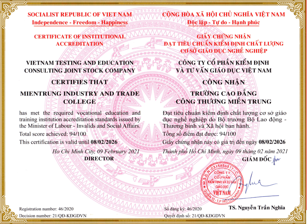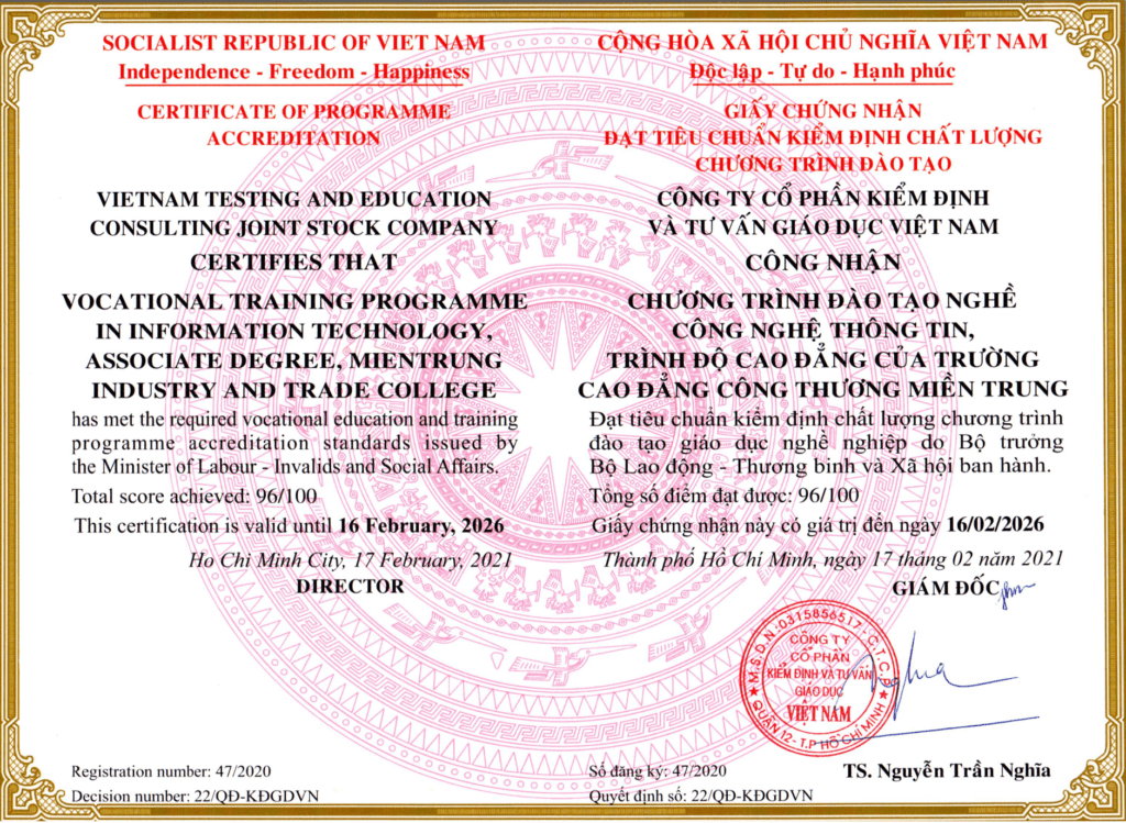 – Chứng nhận Chương trình đào tạo nghề Công nghệ thông tin, trình độ cao đẳng của trường Cao đẳng Công Thương miền Trung đạt chuẩn chất lượng chương trình đào tạo GDNN do bộ LĐ-TB và XH ban hành năm 2021.