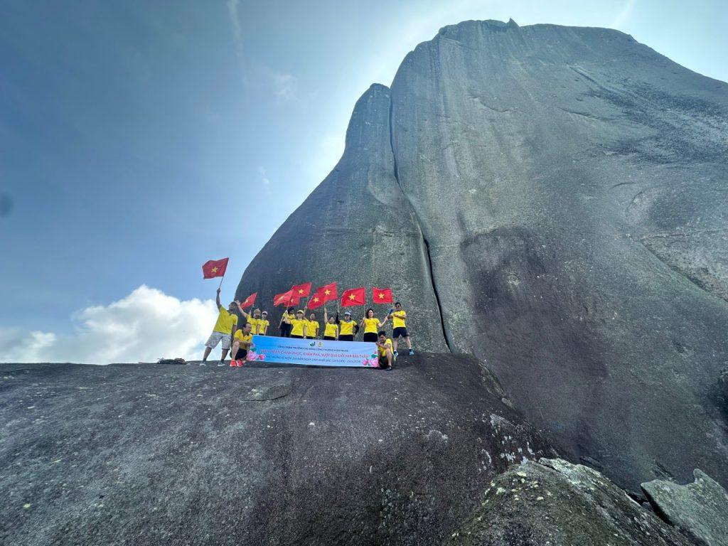 Trải qua hơn 1 tiếng leo núi đầy thử thách, đoàn đã đặt chân lên đỉnh núi Đá Bia. Tại đây, các thành viên được hòa mình vào thiên nhiên hùng vĩ, phóng tầm mắt ngắm nhìn toàn cảnh thành phố Tuy Hòa xinh đẹp. Niềm vui sướng và tự hào vỡ òa khi chinh phục thành công thử thách đã tiếp thêm động lực cho các thành viên tiếp tục hành trình tiếp theo.
