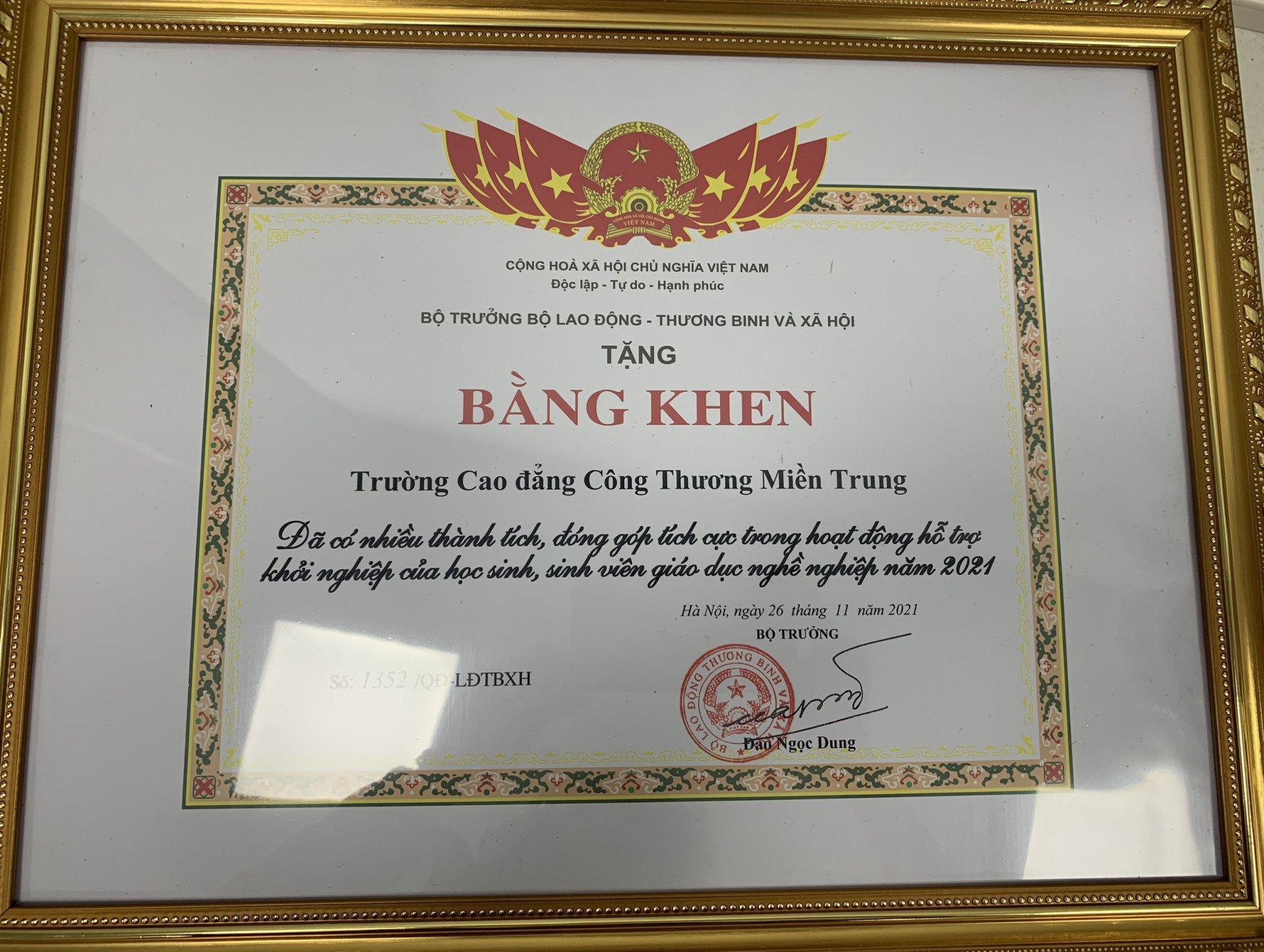 Bằng khen của Bộ Lao động – Thương binh & Xã hội trao cho trường Cao đẳng Công Thương miền Trung có thành tích, đóng góp tích cực trong hoạt động hỗ trợ khởi nghiệp của HSSV GDNN năm 2021