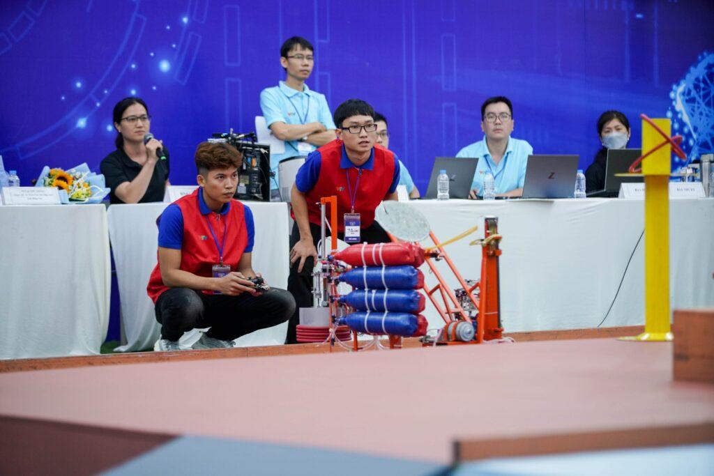 Bạn Trần Anh Tuấn – Sinh viên trường Cao đẳng Công Thương miền Trung, thuộc đội SunshineMITC đang điều khiển Robot Thỏ vào khu vực bắn vòng