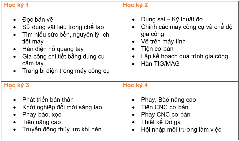 – Có thể tiếp tục học lên trình độ đại học để có thể làm công tác đào tạo chuyên môn thuộc lĩnh vực cơ khí tại các doanh nghiệp có bộ phận đào tạo hoặc cơ sở đào tạo nghề.