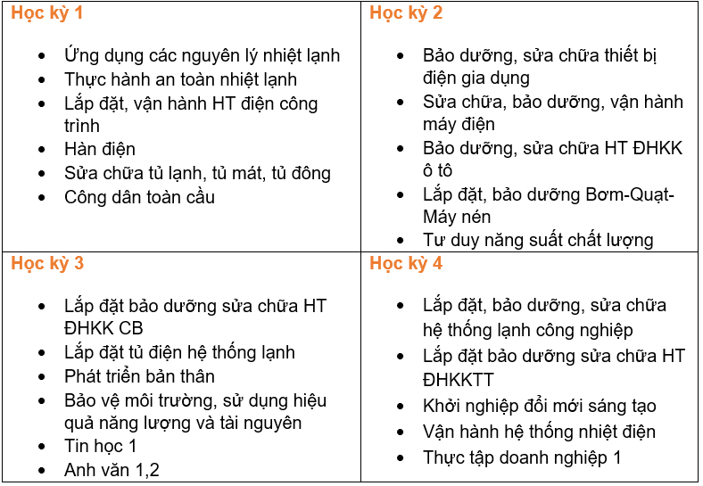 Kỹ thuật viên Kỹ thuật máy lạnh và điều hòa không khí được trang bị những kiến thức, kỹ năng và cập nhật các công nghệ mới nhất lĩnh vực nhiệt lạnh. Bạn sẽ được học tập với các giảng viên, chuyên gia giàu kinh nghiệm. Môi trường học tập năng động và giàu tính thực tiễn, với triết lý đào tạo “Giáo dục khai phóng – Gắn kết thực tiễn – Năng lực sáng tạo”, sinh viên sẽ được tham gia nghiên cứu thực hiện các mô hình dự án khởi nghiệp và các học phần thực tập tại doanh nghiệp chiếm hơn 20% thời lượng chương trình đào tạo.