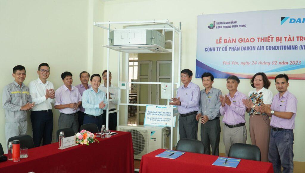 Tham dự buổi bàn giao có Ông Nguyễn Minh Luân – Giám đốc chi nhánh Daikin Khánh Hòa, Ông Nguyễn Tuấn Anh – Quản lý kinh doanh đại lý, Ông Hồ Ngọc Vũ – Trưởng nhóm đào tạo Daikin; về phía trường Cao đẳng Công Thương miền Trung có ThS. Nguyễn Văn Đức – Phó Bí thư Đảng ủy- Phó Hiệu trưởng Nhà trường; TS. Trần Thị Nguyệt Cầm – Trưởng phòng Quản lý đào tạo; ThS. Nguyễn Thanh Thuyền – Phó phòng Tổ chức hành chính; TS. Nguyễn Trung Thoại – trưởng Khoa Điện và Tự động hóa cùng các giảng viên Tổ Điện lạnh.