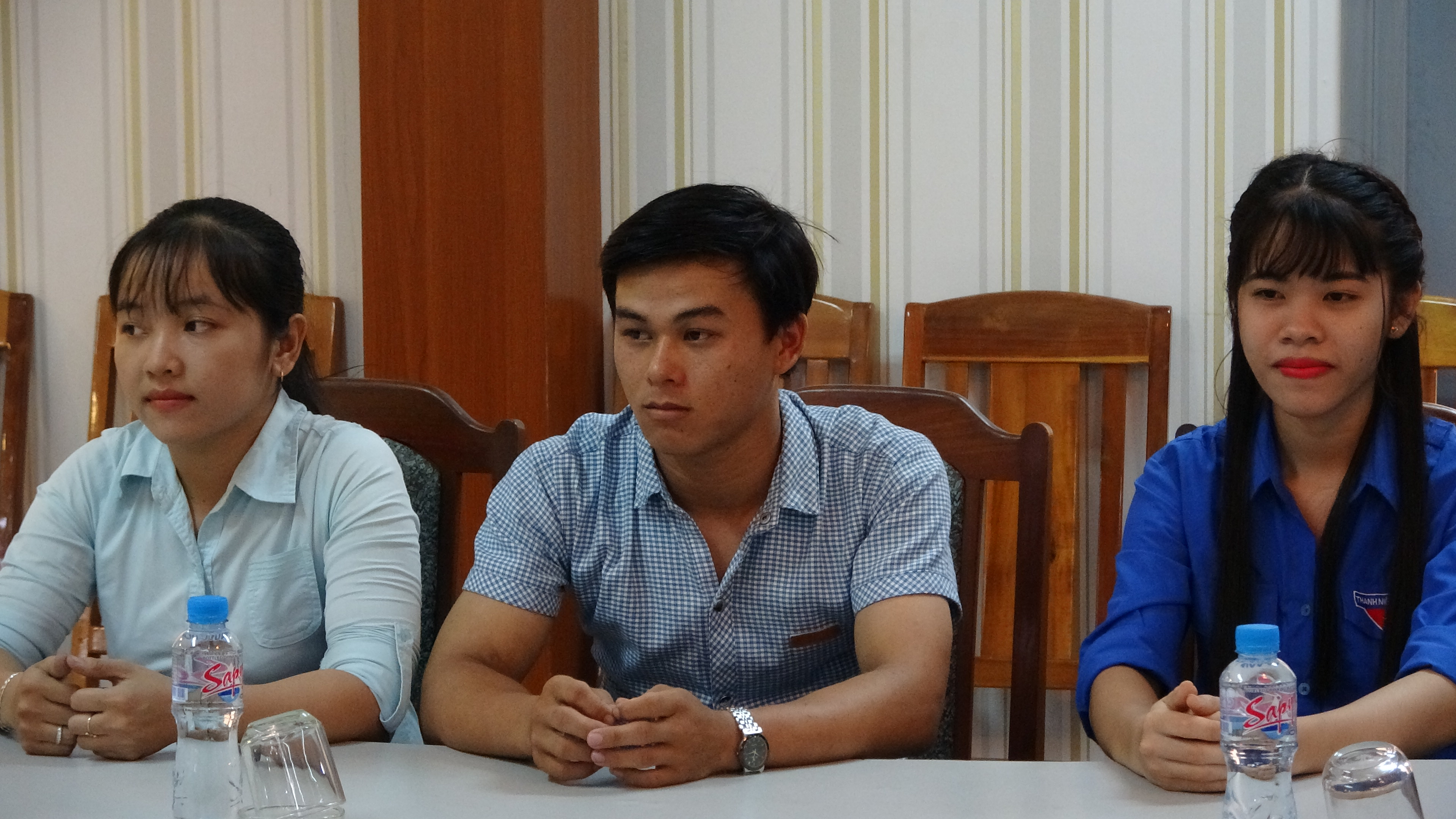 Bạn Ngô Thị Mỹ Nhân – Trưởng nhóm (ngoài cùng bên trái) cùng các thành viên tiếp thu những ý kiến và lời động viên từ các Thầy cô