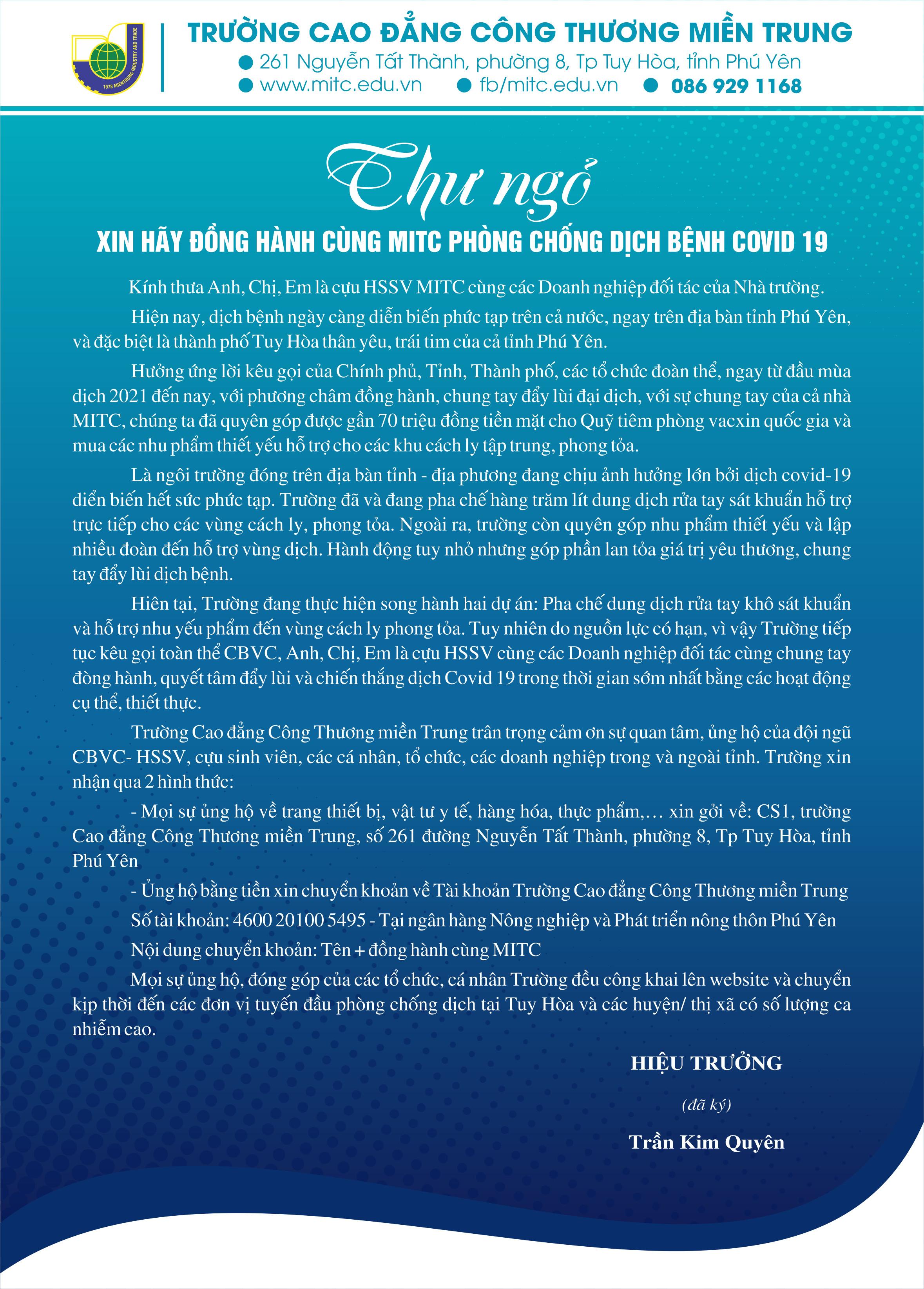Mọi sự ủng hộ, đóng góp của tổ chức, cá nhân, Nhà trường đều công khai lên website và chuyển kịp thời đến các đơn vị tuyến đầu phòng, chống dịch tại Tuy Hòa và các Huyện/Thị có số lượng ca nhiễm cao.