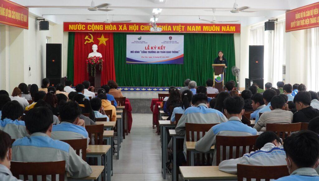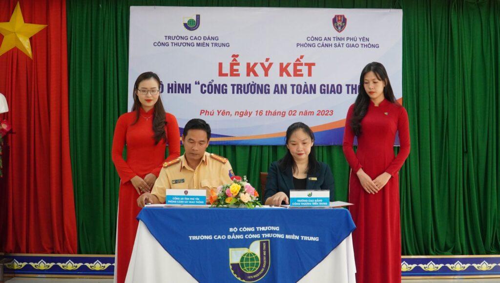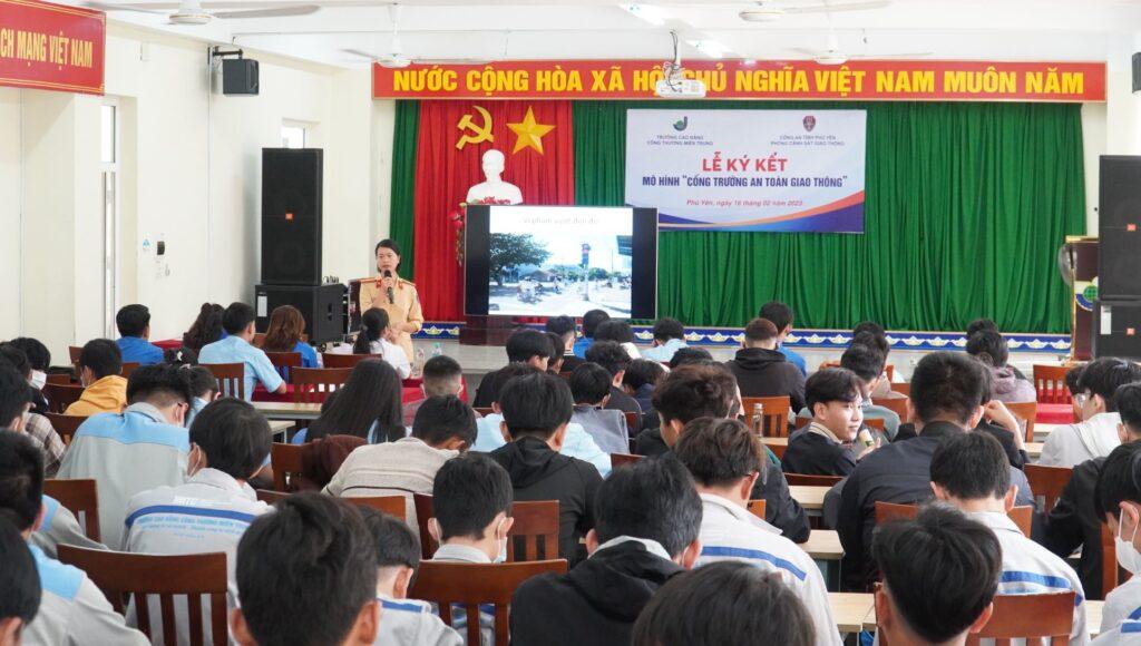 Sáng ngày 16/2 tại Hội trường B2, trường Cao đẳng Công Thương miền Trung đã phối hợp với Phòng Cảnh sát giao thông, Công an tỉnh Phú Yên tổ chức chương trình ký kết Mô hình “Cổng trường An Toàn Giao Thông” và phổ biến pháp luật an toàn giao thông cho hơn 100 HSSV đại diện gần 3000 HSSV toàn trường.