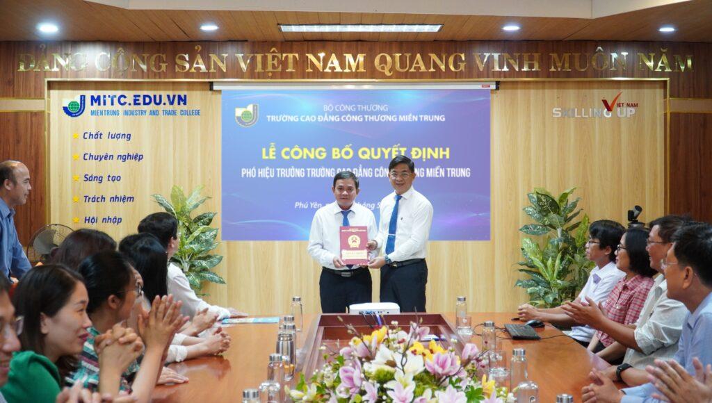 Tại buổi Lễ, ThS. Nguyễn Văn Đức – Phó Bí thư Đảng ủy, Phó Hiệu trưởng, thừa ủy quyền Bộ Công Thương công bố Quyết định bổ nhiệm TS. Lê Kim Anh giữ chức vụ Phó Hiệu trưởng Trường Cao đẳng Công Thương miền Trung. Đồng thời, TS. Trần Kim Quyên cũng thừa ủy quyền Bộ Công Thương trao Quyết định bổ nhiệm Phó Hiệu trưởng và tặng hoa chúc mừng TS. Lê Kim Anh – Tân Phó Hiệu trưởng nhà trường.