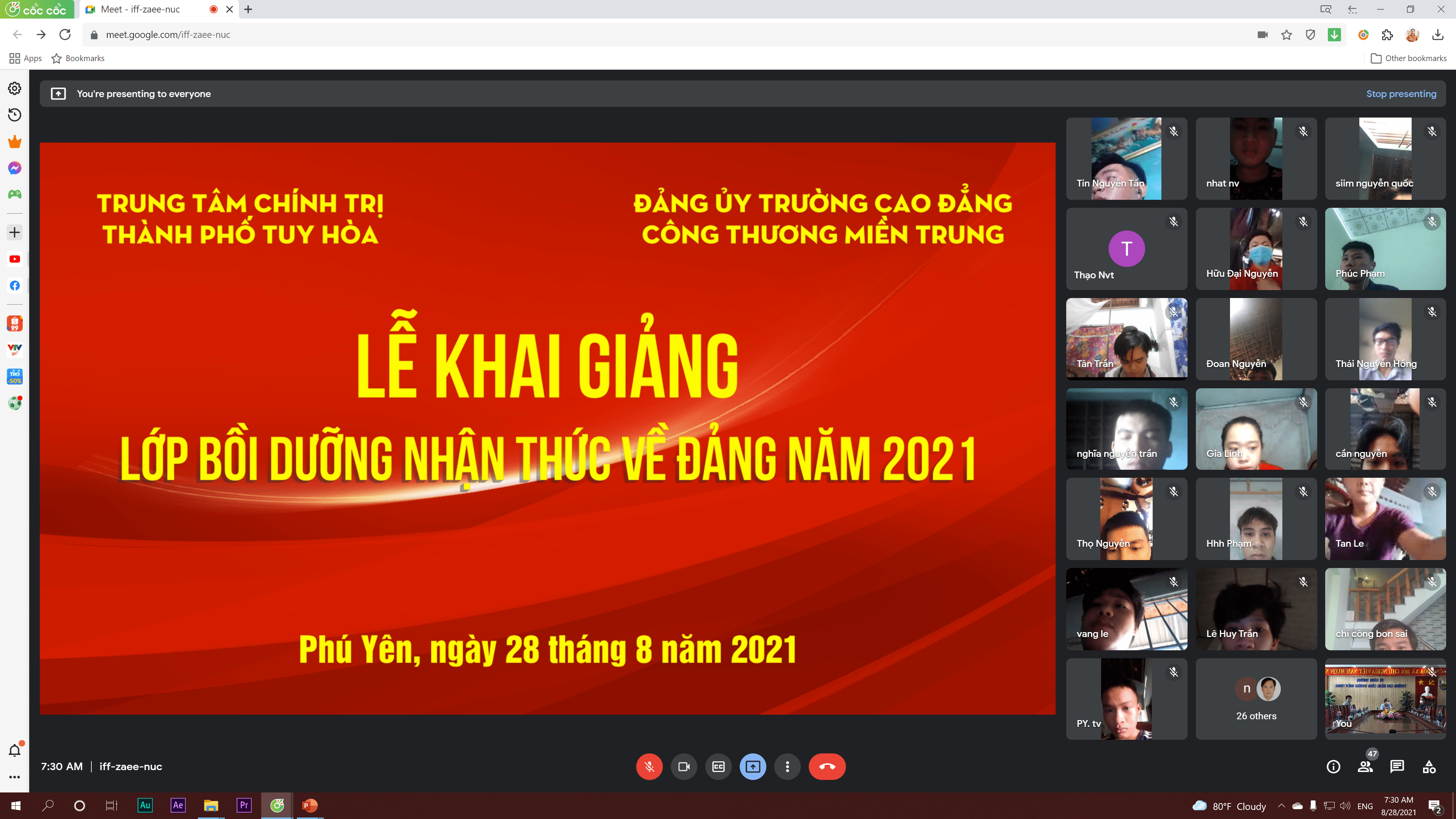 Sáng nay ngày 28/8, tại phòng họp A2, cơ sở 2, trường Cao đẳng Công Thương miền Trung đã tổ chức Lễ khai giảng lớp bồi dưỡng nhận thức về Đảng năm 2021 trên nền tảng trực tuyến.