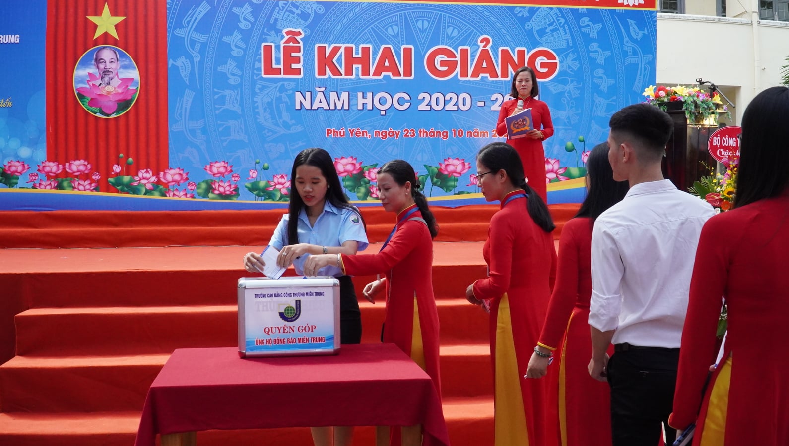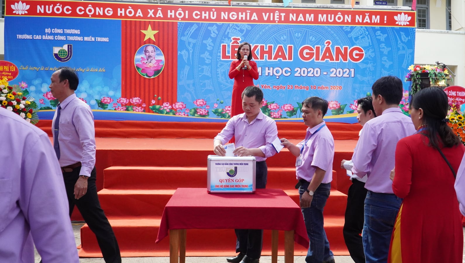 Cũng nhân ngày khai giảng, Nhà trường đã kêu gọi CBVC và HSSV chung tay hướng về đồng bào miền Trung đang hứng chịu thiên tai những ngày qua. Bằng tất cả tấm lòng, đông đảo HSSV và CBVC toàn trường đã hưởng ứng quyên góp giúp đỡ cho đồng bào miền Trung đang gặp khó khăn.