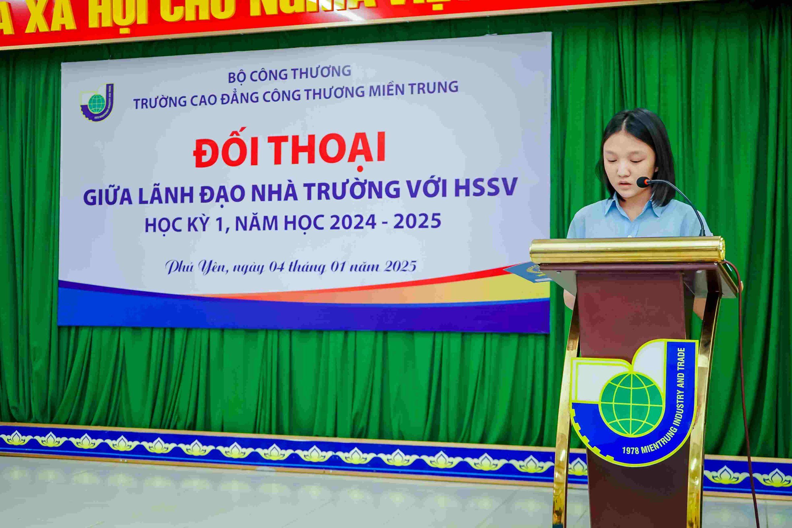 Bạn Trần Lê Khánh Nguyên – sinh viên lớp TC TIN46A, đại diện cho những HSSV có thành tích xuất sắc phát biểu tại buổi đối thoại