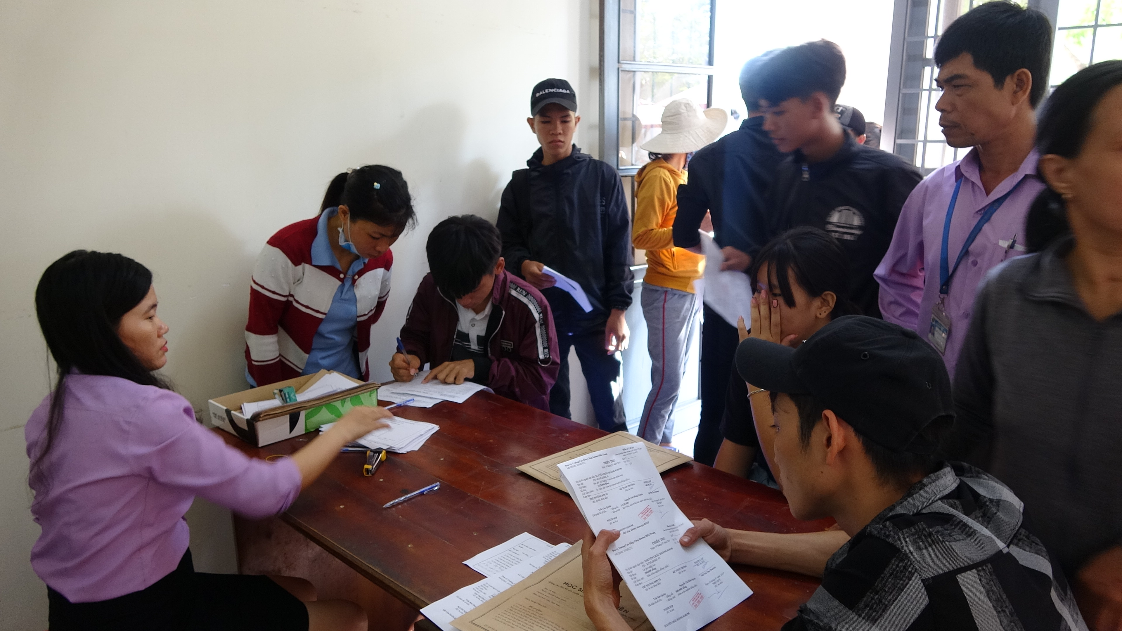 Học sinh sinh viên khóa 42 được các thầy cô hướng dẫn làm thủ tục nhập học
