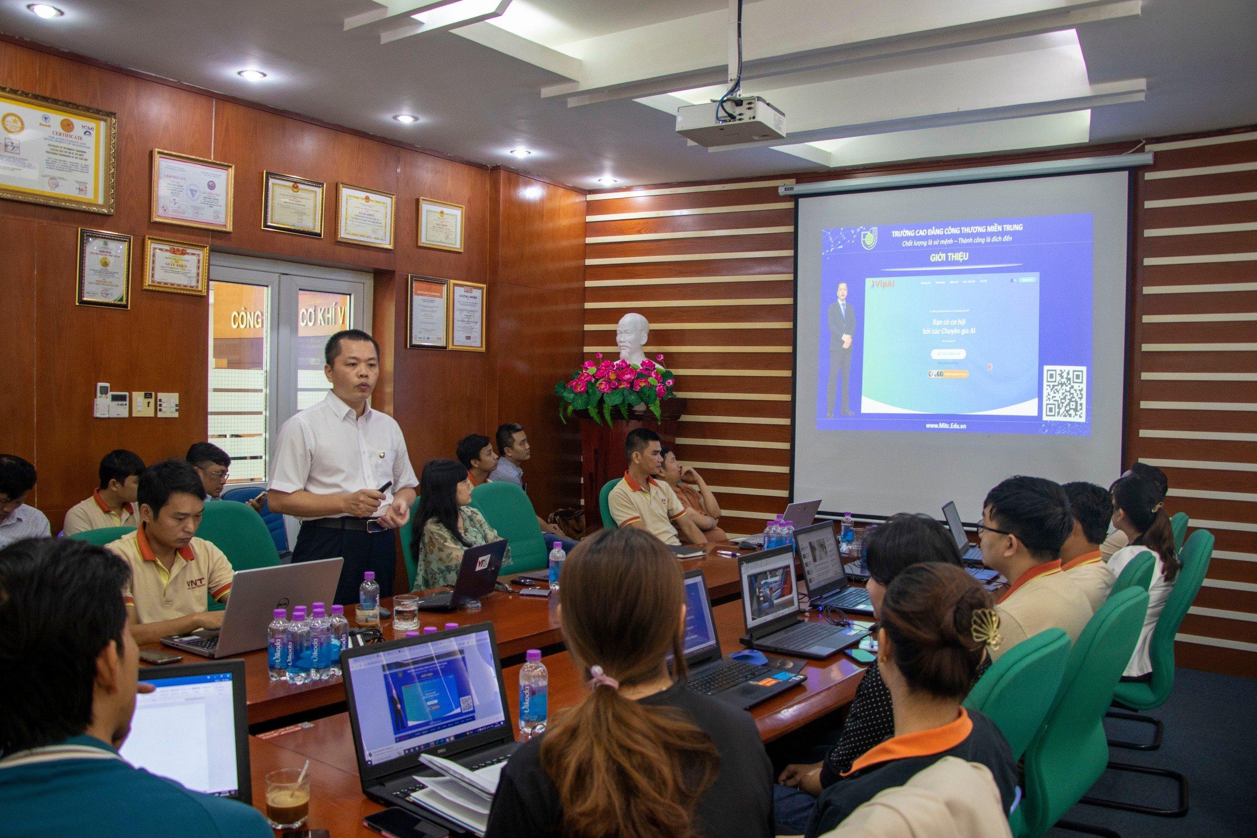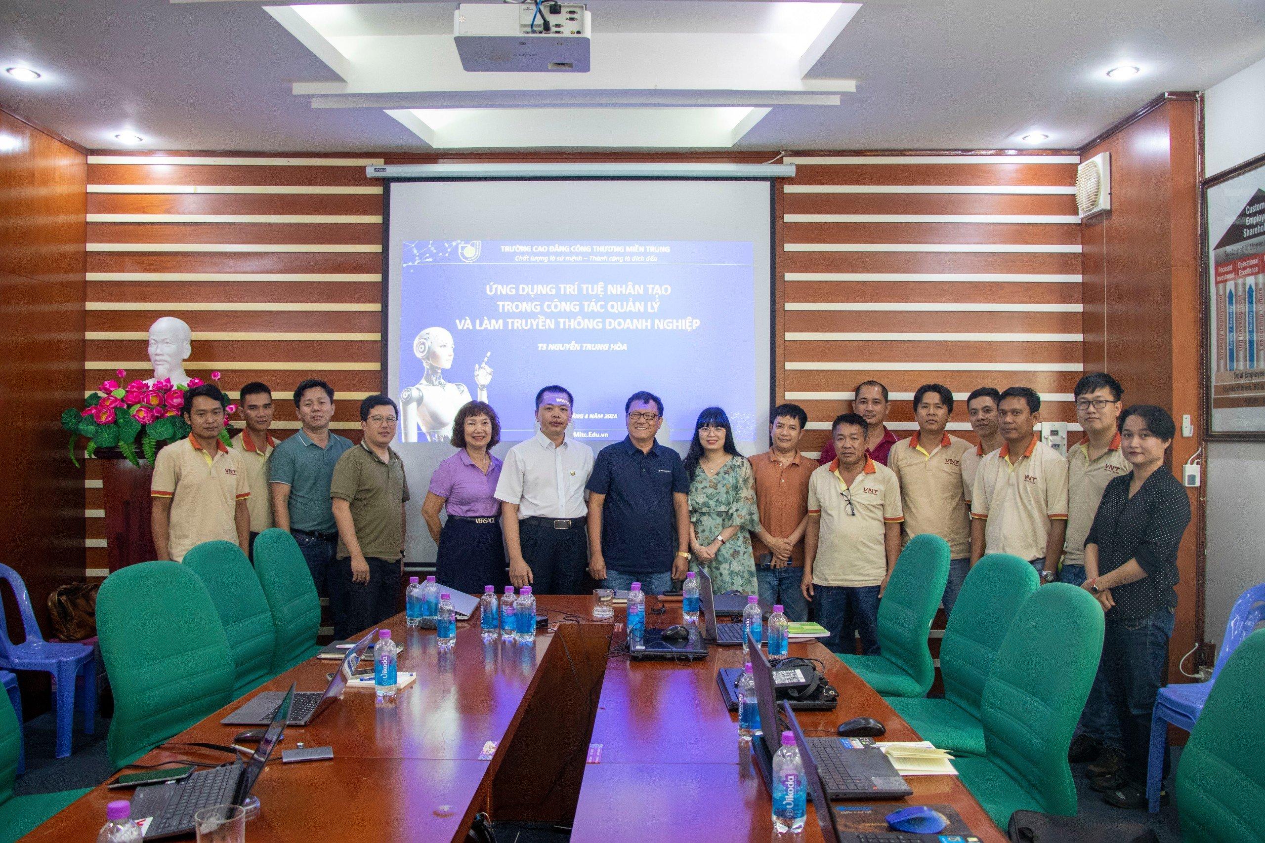 Trước bối cảnh cuộc cách mạng công nghiệp 4.0 đang diễn ra mạnh mẽ, trí tuệ nhân tạo (AI) ngày càng trở nên phổ biến với nhiều lĩnh vực, sự quan tâm và ứng dụng công nghệ AI trong hoạt động quản lý và truyền thông của doanh nghiệp là một xu hướng tất yếu. Điều này đã được minh chứng rõ nét tại buổi chia sẻ chiều ngày 24/4/2024 về ứng dụng AI của Tiến sĩ Nguyễn Trung Hòa – Giám đốc TT Đào tạo và Hợp tác quốc tế, Trường Cao đẳng Công Thương miền Trung (MITC) với đối tác chiến lược của Trường là Công ty Cổ phần Cơ khí Vina Nha Trang.