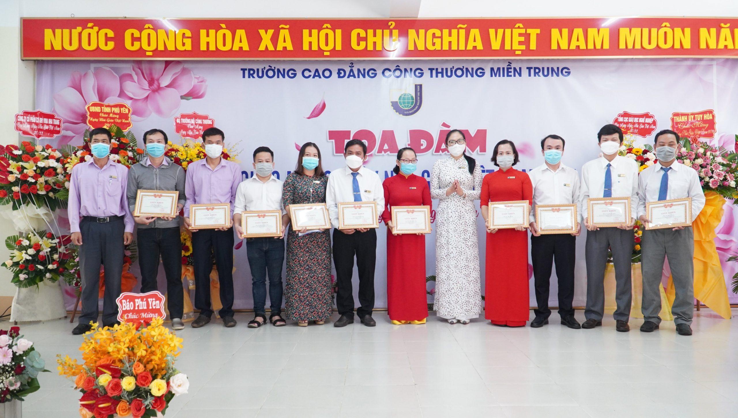 Nhân dịp này, Trường Cao đẳng Công Thương miền Trung đã vinh dự nhận bằng khen của Thủ tướng Chính phủ dành cho 1 tập thể- phòng Quản lý chất lượng & Nghiên cứu khoa học và 1 cá nhân- TS. Nguyễn Thị Kim Ngọc- phó Hiệu trưởng đã có thành tích xuất sắc trong công tác giáo dục từ năm 2016 đến 2020 góp phần vào sự nghiệp xây dựng chủ nghĩa xã hội và bảo vệ Tổ quốc. Tập thể trường Cao đẳng Công Thương miền Trung vinh dự là 1 trong 4 đơn vị trực thuộc Bộ Công Thương đón nhận cờ thi đua xuất sắc từ Bộ Công Thương Việt Nam. Đồng thời, hai cá nhân là TS. Trần Kim Quyên- Hiệu trưởng nhà trường và Ths. Bùi Mạnh Tuấn- trưởng Khoa Cơ khí nhận huy hiệu và bằng khen Chiến sỹ thi đua Bộ Công Thương. Công Đoàn nhà trường cũng đã vinh dự được Công Đoàn Công Thương tặng cờ thi đua xuất sắc và khen thưởng 4 cá nhân có thành tích xuất sắc và TS. Trần Thị Nguyệt Cầm- trưởng Khoa Tin Học – Kinh tế nhận bằng khen từ tổng Liên đoàn Lao động Việt Nam.