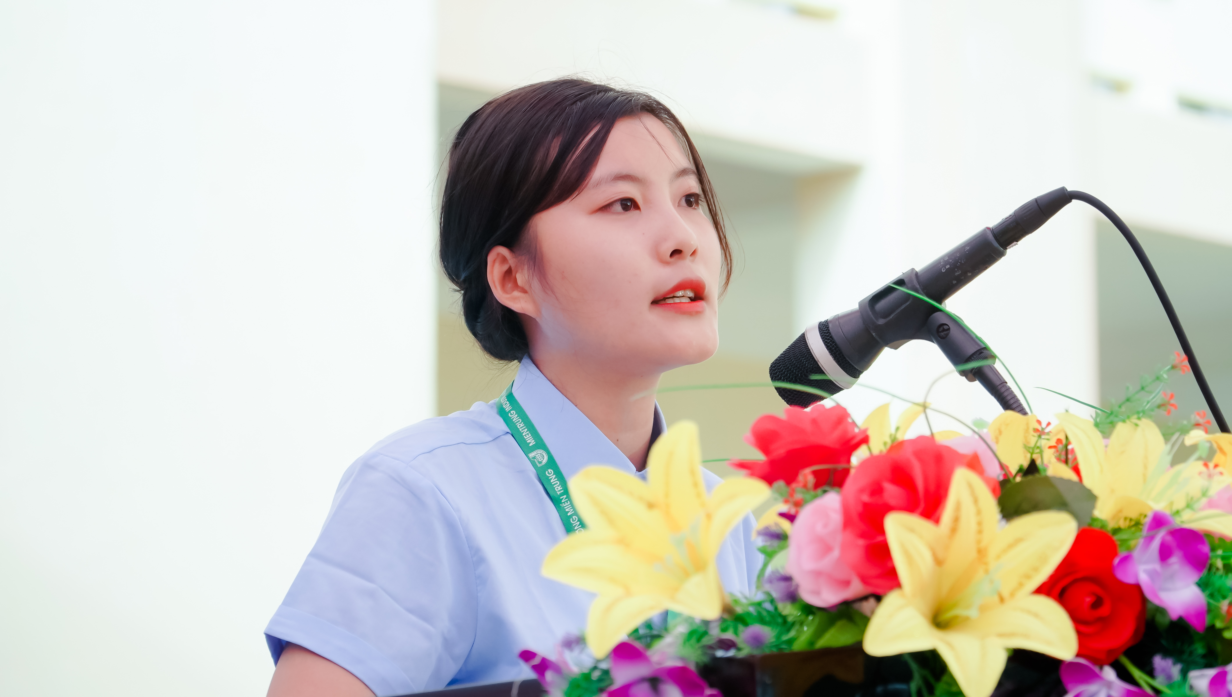 Sinh viên Võ Thị Mỹ Ngọc, Đại diện cho toàn thể HSSV trường, phát biểu cảm nghĩ trong buổi Lễ khai giảng