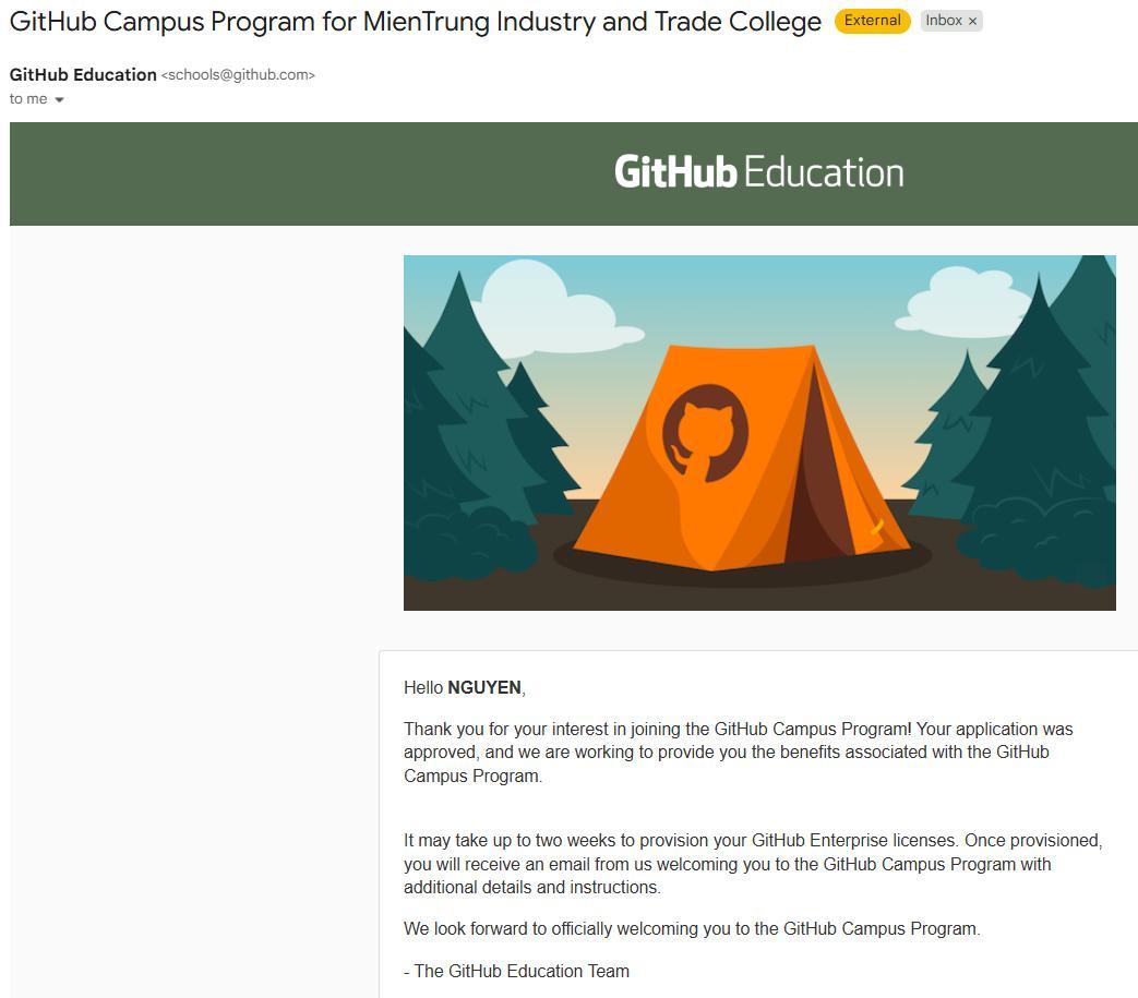 Thư được gửi từ GitHub Campus Program đến trường Cao đẳng Công Thương miền Trung