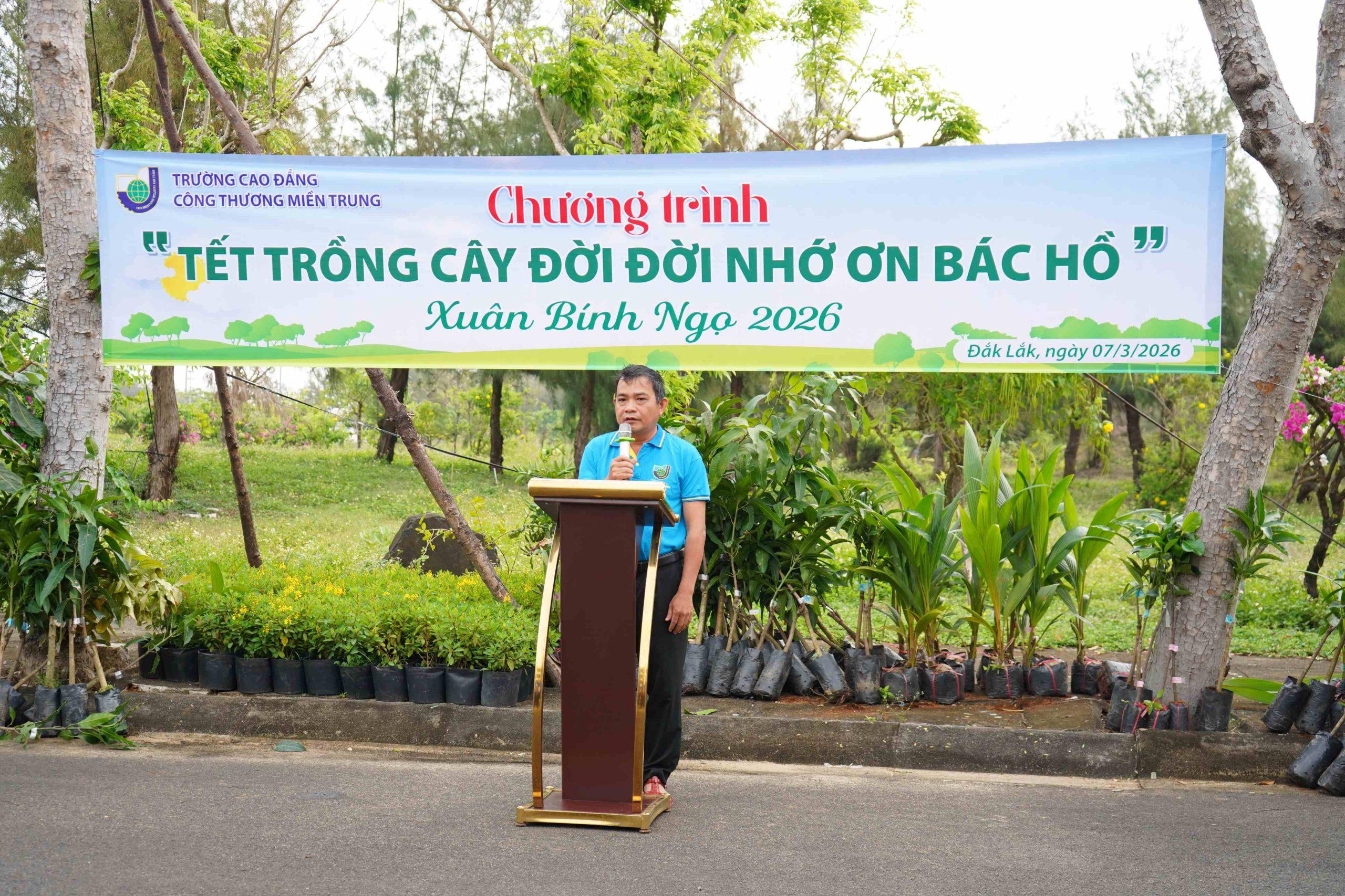 Phát biểu tại chương trình, đồng chí Lê Kim Anh – Phó Hiệu trưởng Nhà trường đã chính thức phát động phong trào Tết trồng cây “Đời đời nhớ ơn Bác Hồ” năm 2026, nhấn mạnh ý nghĩa nhân văn sâu sắc của hoạt động trồng cây trong việc bảo vệ môi trường, cải thiện cảnh quan và xây dựng lối sống xanh trong cộng đồng. Trong nhiều năm qua, Trường Cao đẳng Công Thương miền Trung luôn chú trọng trồng mới và chăm sóc cây xanh trong khuôn viên trường, góp phần tạo nên không gian học tập trong lành, thân thiện và bền vững.