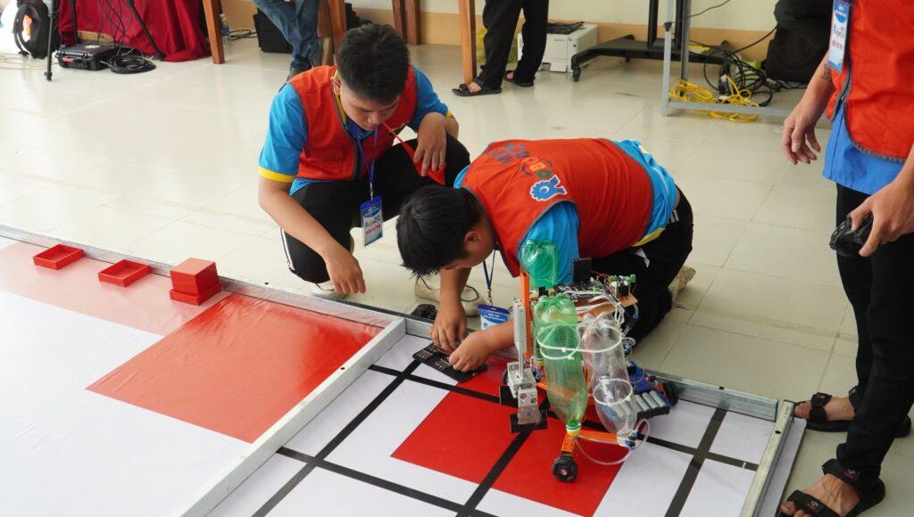 Robot của đội T-Rex bị trục trặc kỹ thuật các thành viên trong đội bình tĩnh hỗ trợ nhau sửa chữa