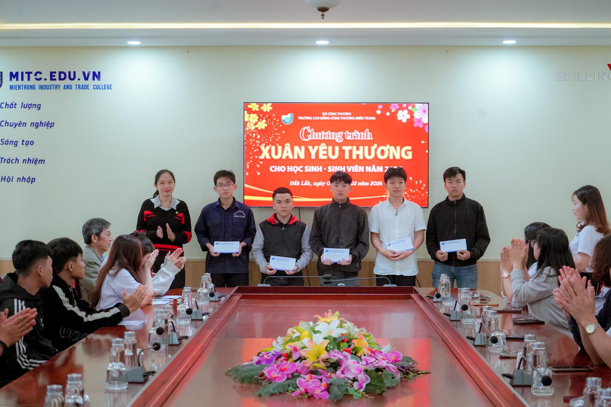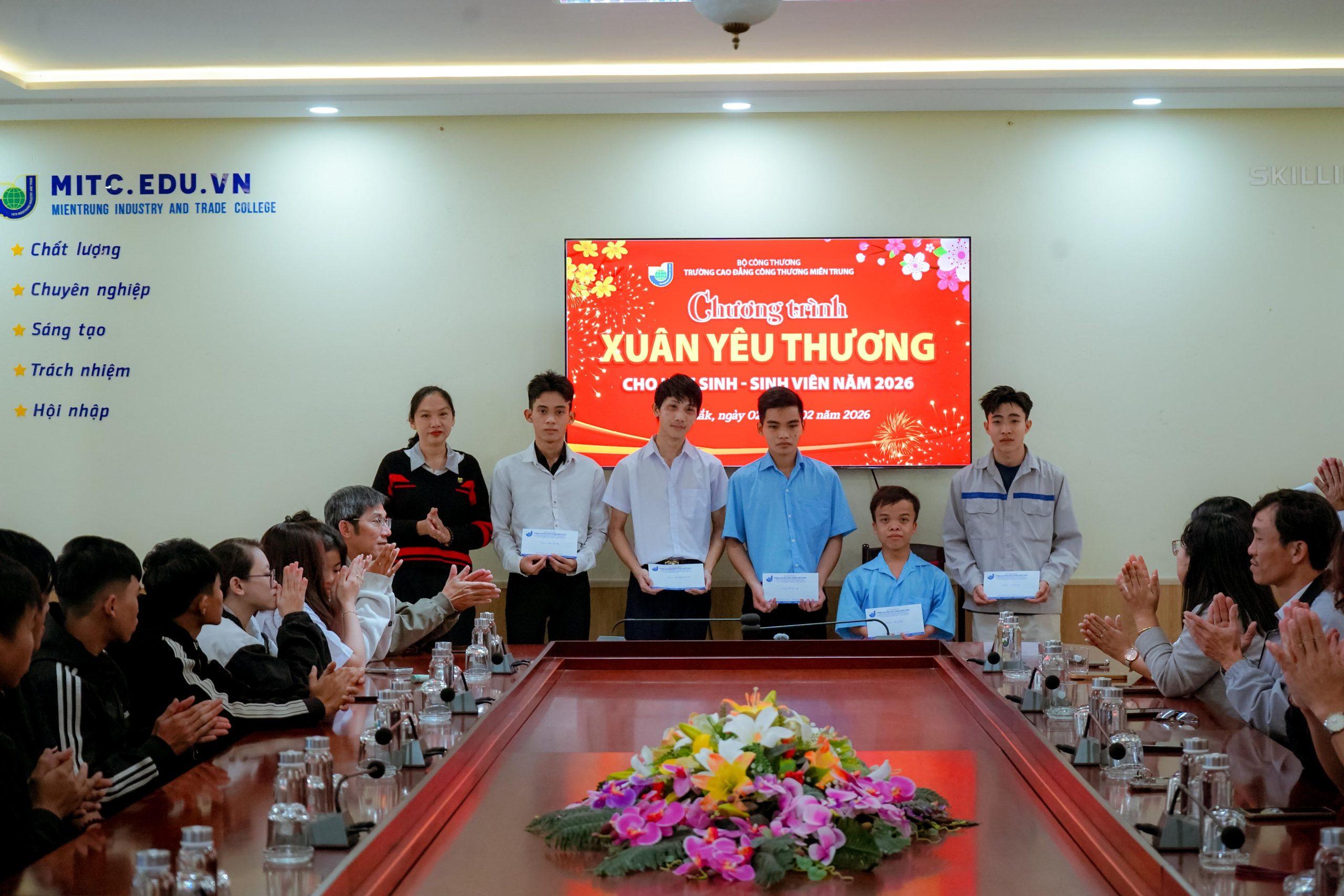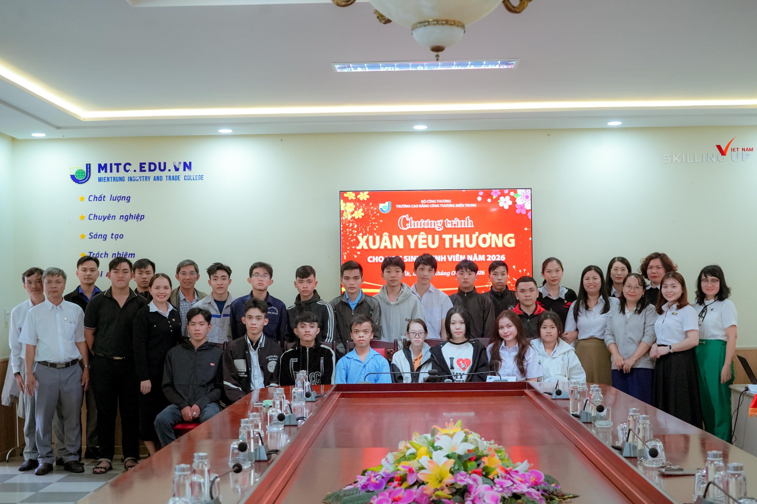 Chiều ngày 02/02/2026, Trường Cao đẳng Công Thương miền Trung (MITC) đã tổ chức chương trình “Xuân yêu thương” năm 2026 dành cho học sinh, sinh viên (HSSV) có hoàn cảnh khó khăn, nhằm mang đến không khí Tết ấm áp, sẻ chia trước thềm Tết Nguyên đán Bính Ngọ.