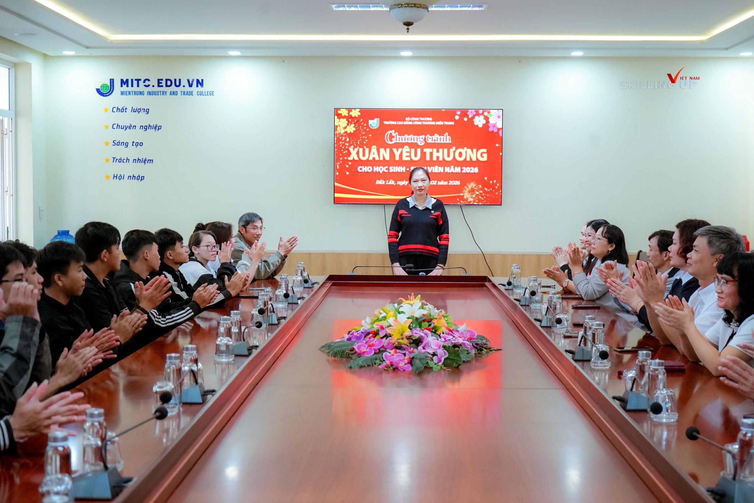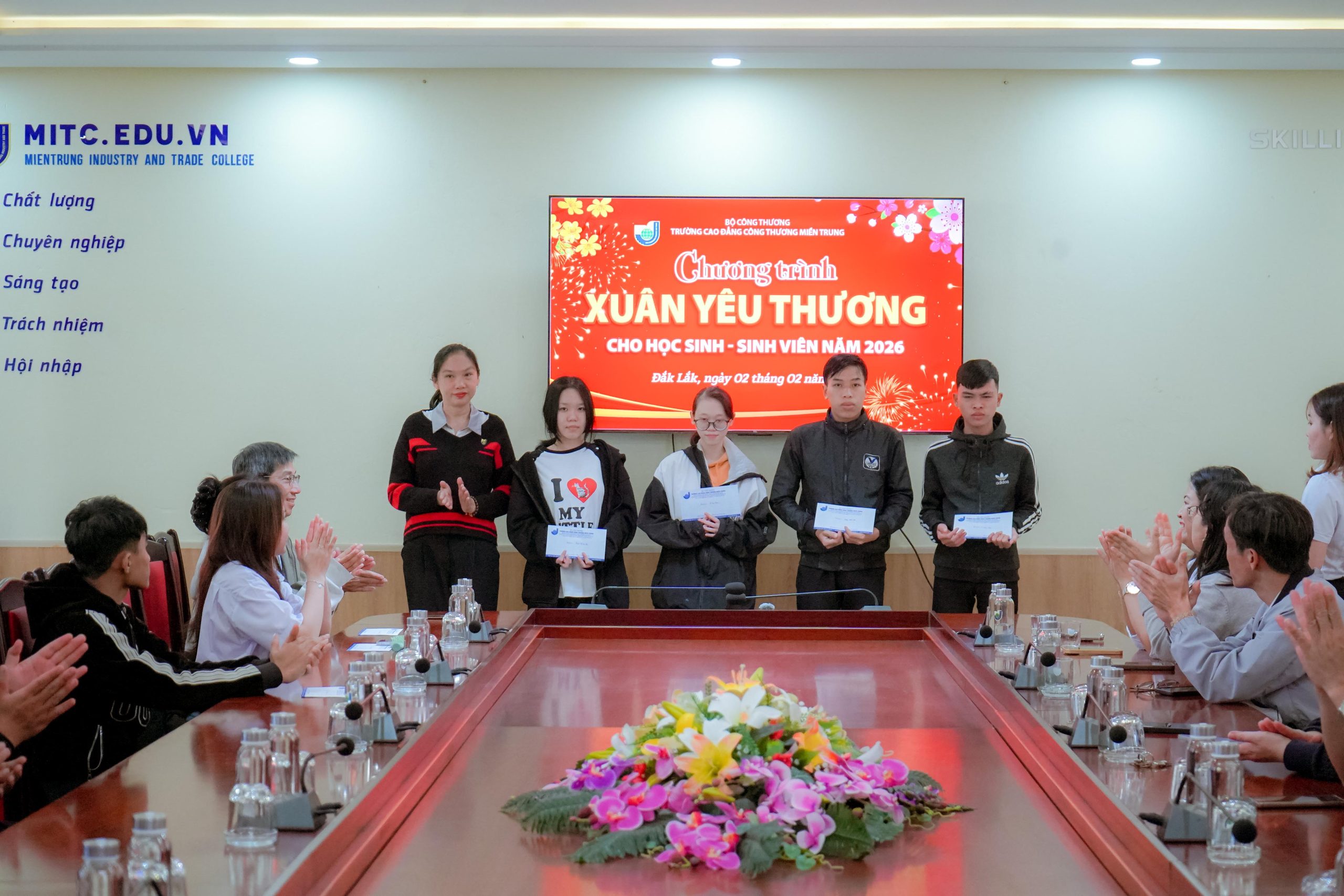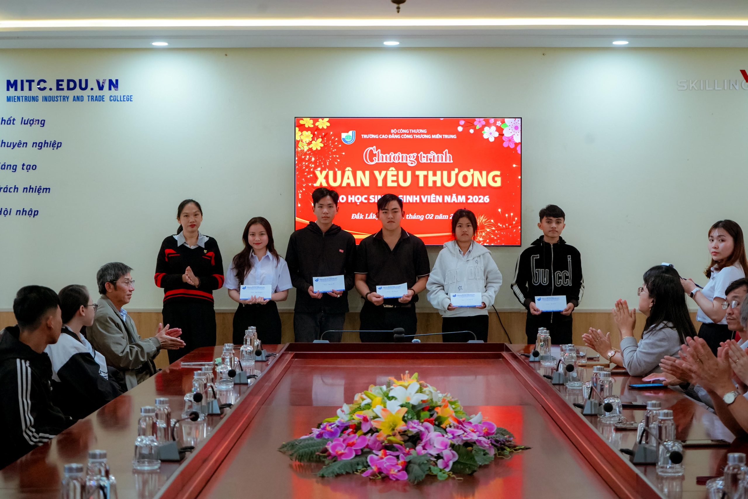 Chiều ngày 02/02/2026, Trường Cao đẳng Công Thương miền Trung (MITC) đã tổ chức chương trình “Xuân yêu thương” năm 2026 dành cho học sinh, sinh viên (HSSV) có hoàn cảnh khó khăn, nhằm mang đến không khí Tết ấm áp, sẻ chia trước thềm Tết Nguyên đán Bính Ngọ.