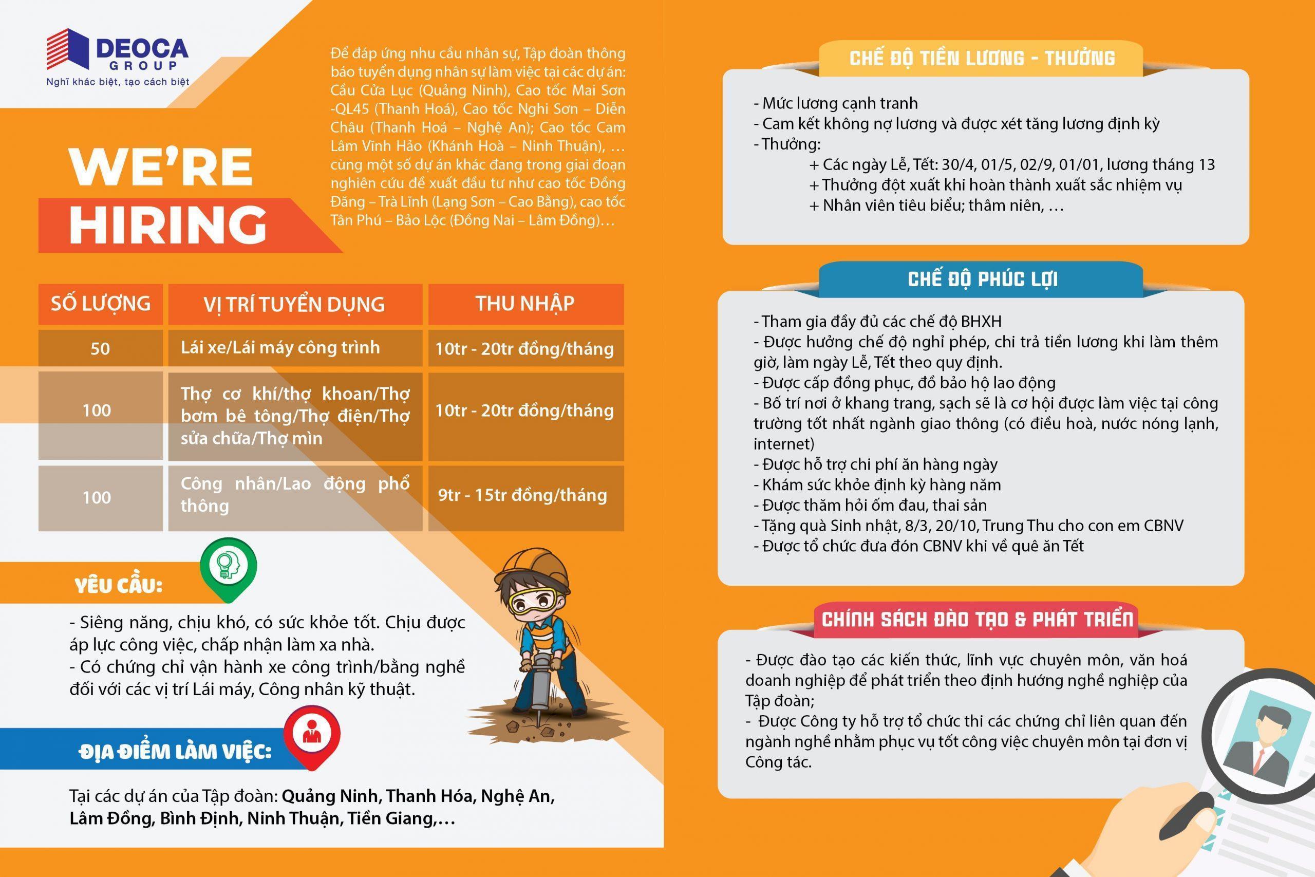 Công ty CP Tập đoàn Đèo Cả tuyển dụng nhiều vị trí với số lượng nhân sự lớn, mức lương cao và nhiều chính sách ưu đãi (thông tin cụ thể ở file đính kèm bên dưới). Để biết thêm thông tin vui lòng liên hệ Cô Ngọc Thùy (ĐT: 0984368124).