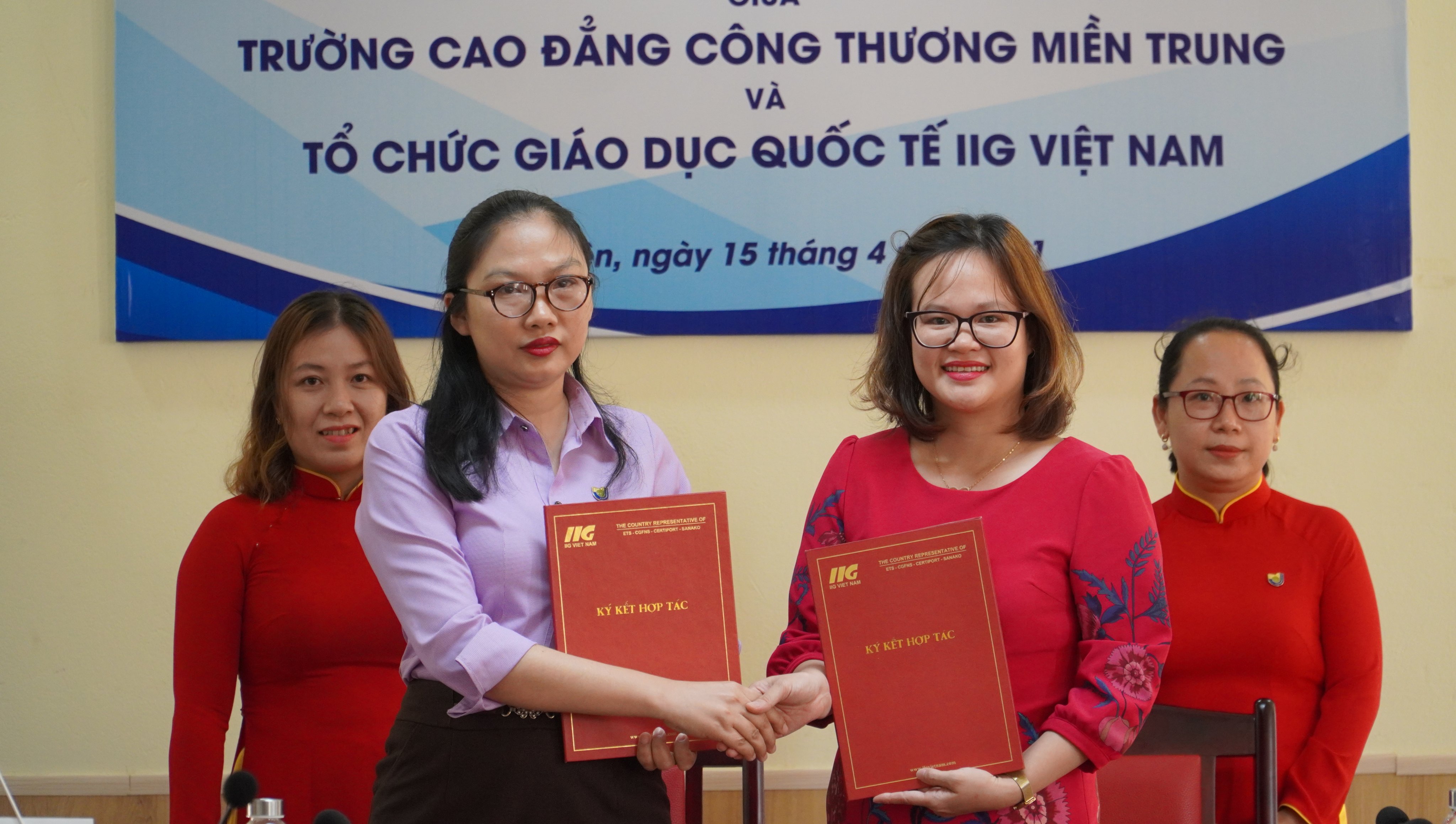 TS. Nguyễn Thị Kim Ngọc và bà Phạm Thị Khánh Phượng đã cùng ký vào bản hợp tác giữa trường Cao đẳng Công Thương miền Trung và tổ chức Giáo dục quốc tế IIG Việt Nam