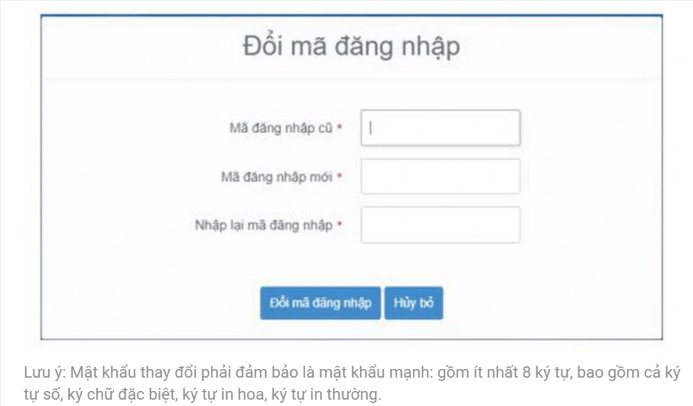 Bước 3: Đổi mật khẩu sau khi đăng nhập, màn hình Đổi mã đăng nhập sẽ được hiển thị. Thí sinh cần tiến hành đổi mã đăng nhập mới theo ý muốn của mình để tăng cường bảo mật cho tài khoản của mình khi đăng ký dự thi tốt nghiệp THPT.