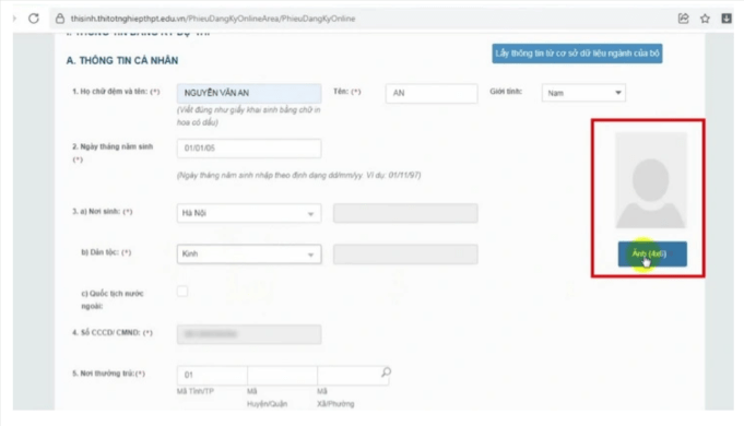 – Mục ảnh: Là khu vực để tải lên ảnh thẻ, chỉ nhận ảnh có định dạng JPG hoặc JPEG, có kích thước 4 x 6 cm và được chụp không quá 6 tháng kể từ ngày đăng ký dự thi THPT 2024.