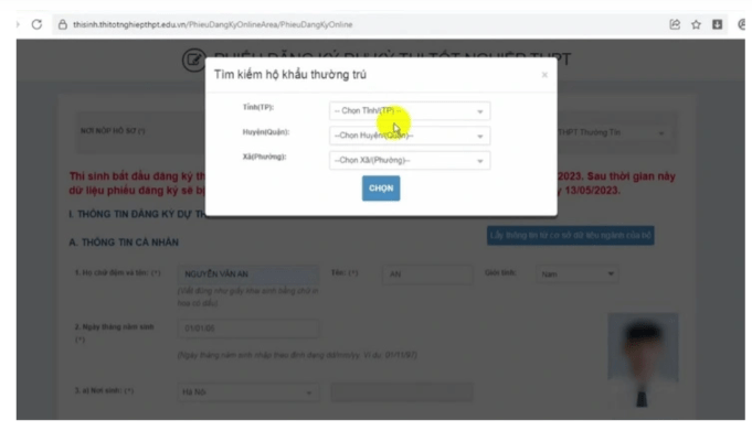 – Mục 5 (nơi thường trú): Là nơi để nhập mã tỉnh/thành phố, mã huyện/quận và mã xã/phường. Nếu chưa biết mã, thí sinh có thể nhấp vào biểu tượng “tìm kiếm”, sau đó chọn tỉnh/thành phố, huyện (quận) và xã (phường) thường trú của mình và nhấn vào nút “Chọn”. Hệ thống sẽ tự động điền mã tương ứng vào các ô ở mục 5.
