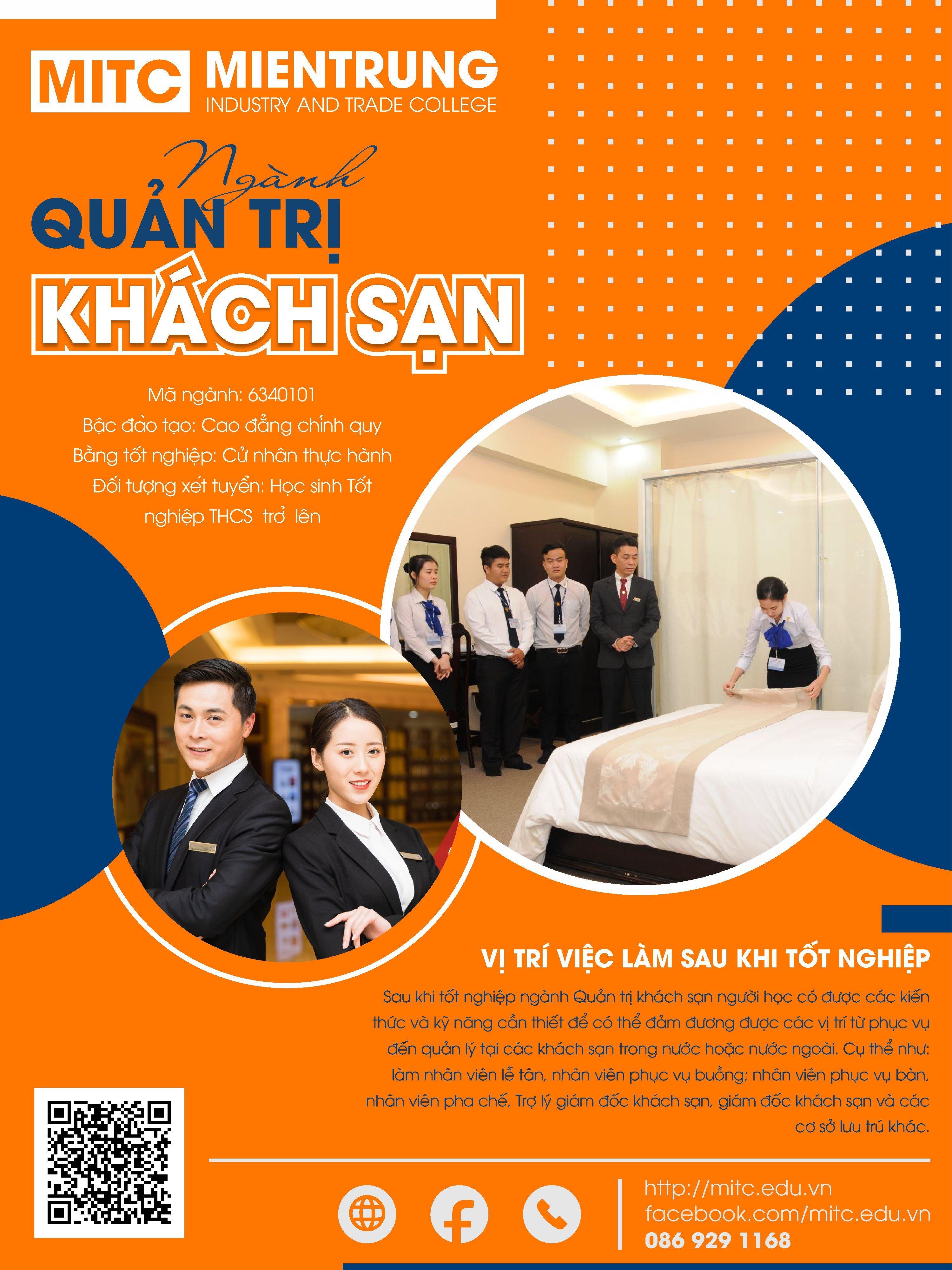 Với triết lý đào tạo “ thực học – thực nghiệp – chủ động hội nhập”, tại trường Cao Đẳng Công Thương miền Trung các bạn sẽ được học với giáo trình học phong phú, cùng đội ngũ giảng viên giàu kinh nghiệm, sẽ giúp các bạn có nền tảng vững chắc để thực nghiệp ở các doanh nghiệp. Ngoài ra Trường Cao đẳng Công Thương miền Trung còn phối hợp cùng các doanh nghiệp tổ chức các hội thảo chuyên đề, kỳ thực tập Doanh nghiệp và ký kết thỏa thuận hợp tác tuyển dụng, thực tập với với đa dạng các công ty, doanh nghiệp trong và ngoài nước. Chính vì thế ngay tại trường, bạn đã có thể tìm kiếm và chinh phục được cơ hội nghề nghiệp trong tầm tay. Nếu bạn thấy yêu thích ngành nghề này, đăng kí ngay ngành Quản trị khách sạn tại MITC nhé.