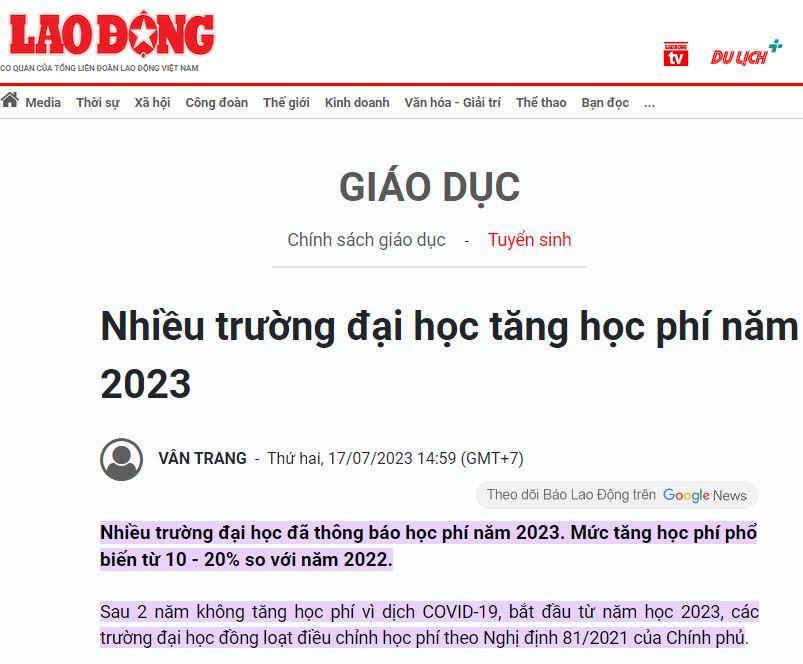 Trích báo Lao động (https://laodong.vn/tuyen-sinh/nhieu-truong-dai-hoc-tang-hoc-phi-nam-2023)