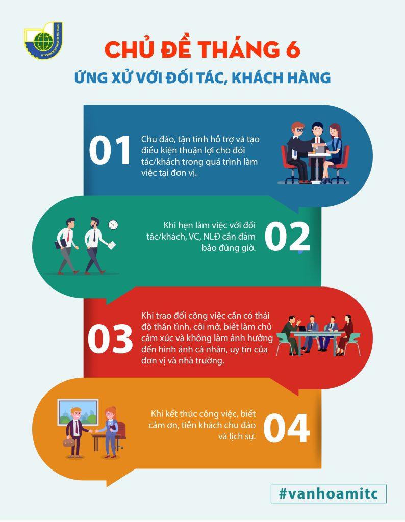 Trong xã hội phát triển ngày nay, khách hàng và đối tác có quyền đòi hỏi về chất lượng dịch vụ chăm sóc khách hàng, quan hệ hợp tác kinh doanh mua bán ngày một tốt hơn. Cách tốt nhất để biết khách hàng và đối tác có thỏa mãn hay không thì hãy lắng nghe họ phản hồi những gì để kịp thời khắc phục và xử lý thỏa đáng, đáp ứng tâm tư nguyện vọng của họ, đó là phần rất quan trọng trong việc phát triển kinh doanh và nâng cao uy tín tổ chức. Vì thế MITC đã Ban hành kế hoạch triển khai Văn hóa MITC với chủ đề tháng 6: Ứng xử với đối tác, khách hàng.